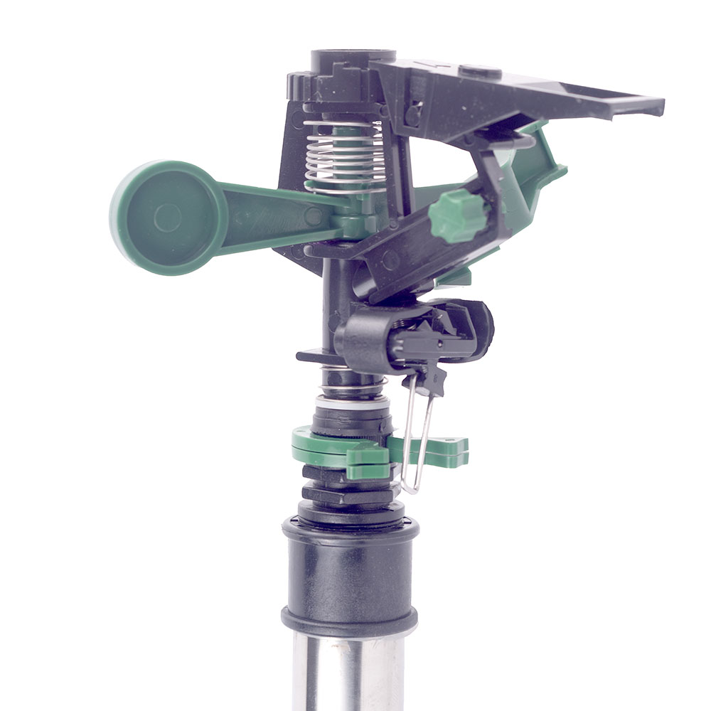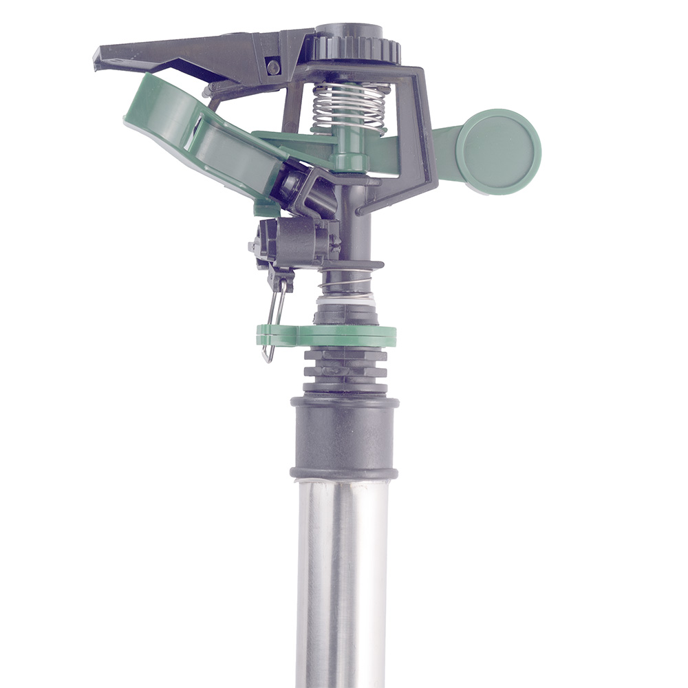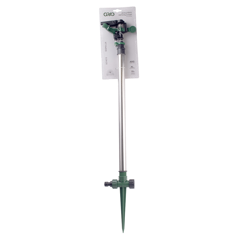 Дощувач Grad імпульсний на штанзі (ABS+AL) - надійний садовий інструмент, призначений для кругового та секторного поливу присадибних ділянок, городів, клумб та газонів. Завдяки піднятій конструкції пристрій забезпечує широке розпилення води, що дозволяє ефективно зволожувати рослини різної висоти на значній площі.