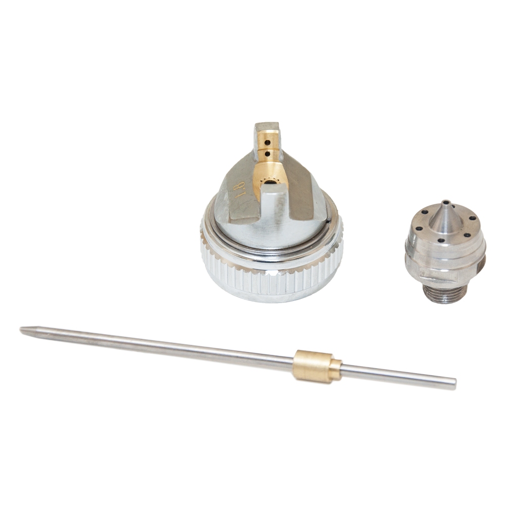 - Комплектація дюзами: інструмент постачається з двома змінними головками діаметром 1.3 мм та 1.8 мм, що робить пристрій універсальним для роботи з базовими покриттями, лаками та ґрунтами різної в'язкості.