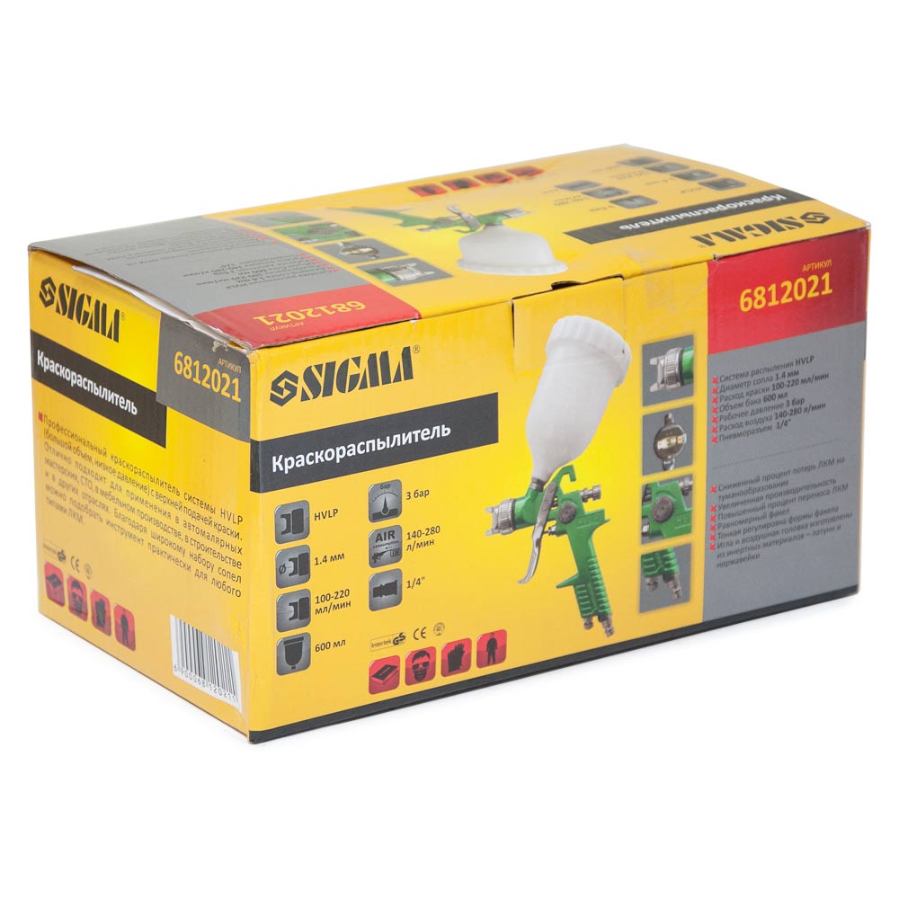 Фарборозпилювач Sigma HVLP Ø1.4 мм 140-280л/хв 3бар в/б 600 мл (пласт) зелений — це професійний пневматичний інструмент, розроблений для високоефективного нанесення лакофарбових матеріалів. Завдяки використанню технології HVLP (High Volume Low Pressure), дана модель забезпечує чудову якість фінішного покриття при суттєвому зменшенні витрат фарби.