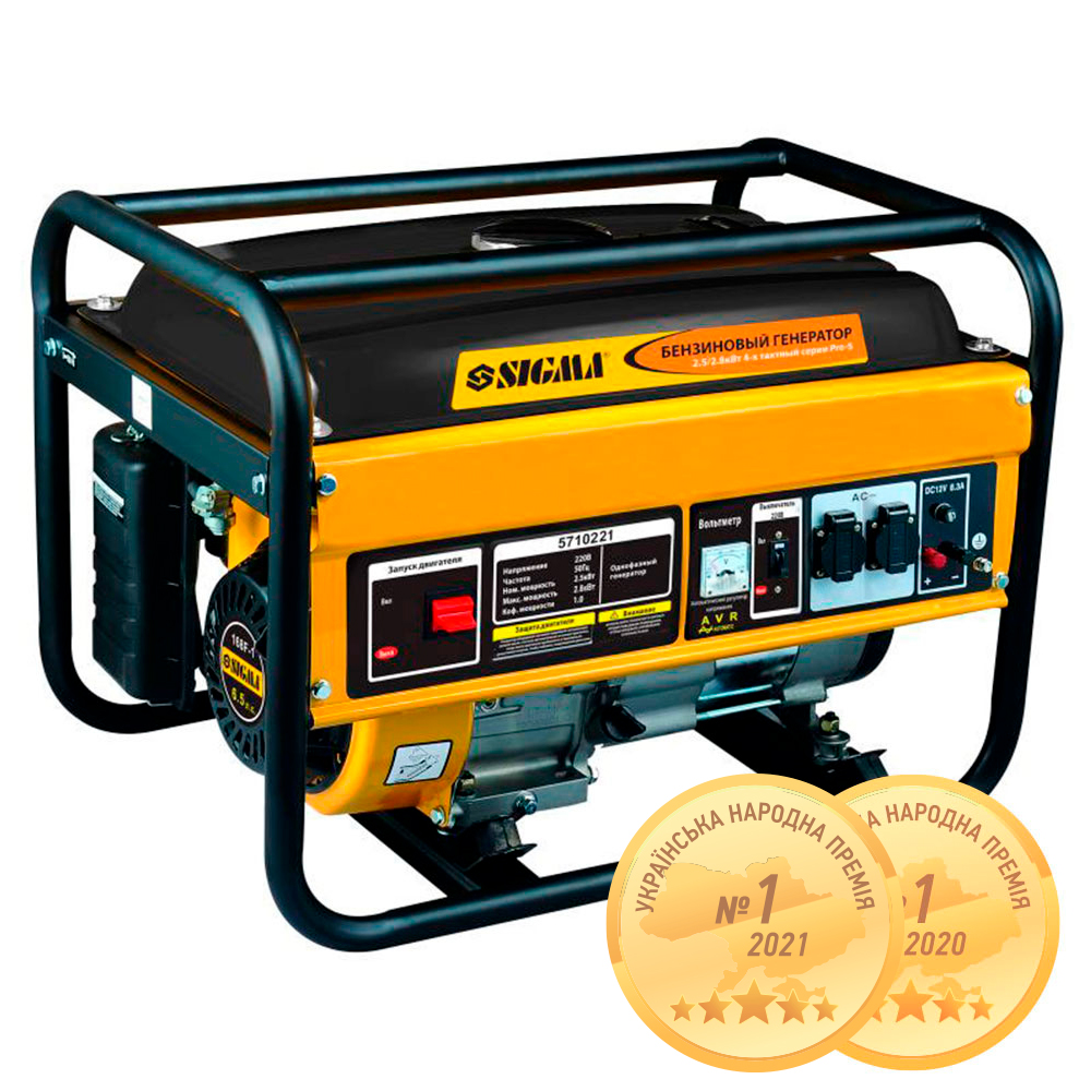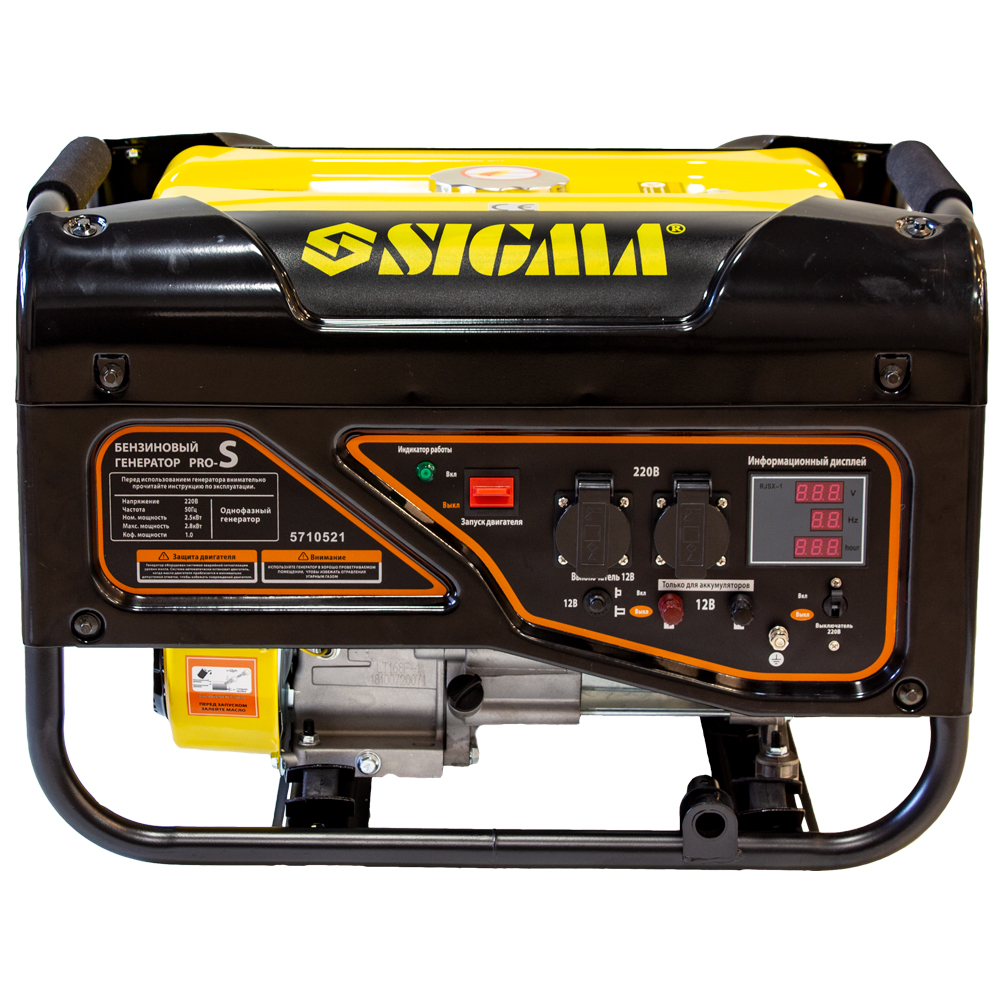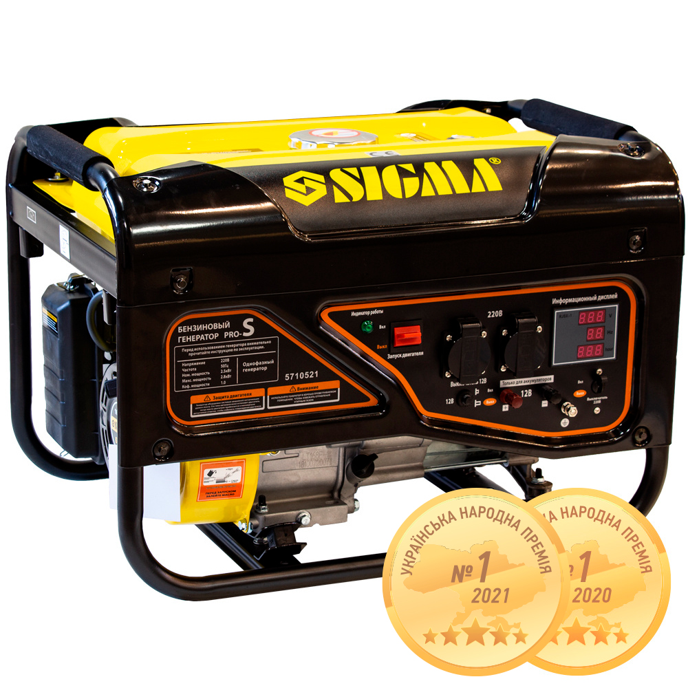 Генератор бензиновий Sigma Pro-S 2.5/2.8кВт 4-х тактний ручний старт — це сучасна компактна міні-електростанція (модель 5710521), яка стане надійним джерелом струму для невеликого котеджу або офісу. Агрегат оснащений мідною обмоткою альтернатора та автоматичним регулятором напруги (AVR), що забезпечує безпечне живлення побутової техніки та електроінструментів. Посилена рама з антивібраційними подушками та захисні екрани паливного бака роблять пристрій Sigma довговічним та зручним у транспортуванні, а цифровий дисплей дозволяє легко контролювати робочі параметри (вольтаж, частоту, мотогодини).