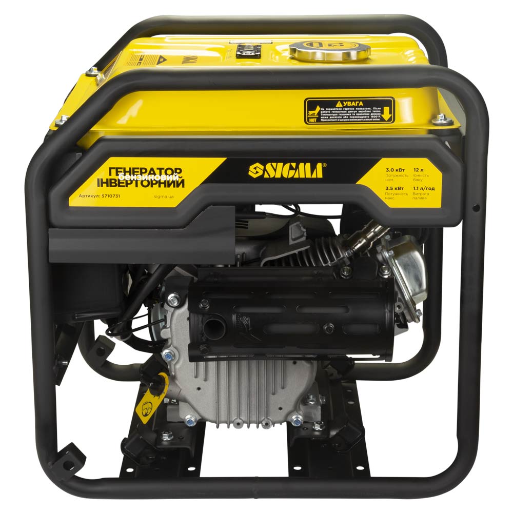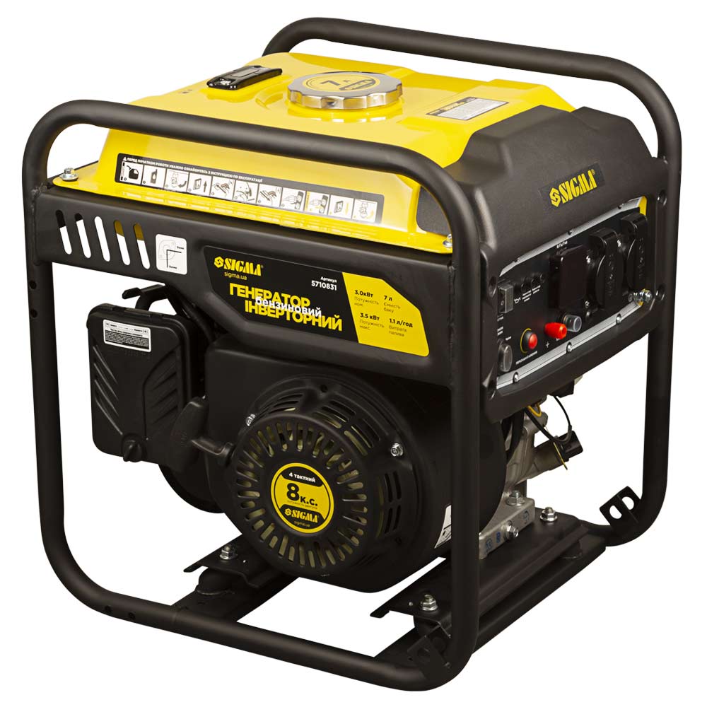 Генератор інверторний бензиновий Sigma 220В 3.0/3.5кВт 7л 4-х тактний ручний запуск — це сучасна міні-електростанція, здатна повноцінно забезпечити живленням невеликий будинок або офіс. Агрегат може ефективно використовуватися як резервне або постійне джерело струму. З його допомогою можна приводити в дію різні електроінструменти, побутову техніку та обладнання. Інверторні пристрої незамінні, якщо необхідно подати напругу на техніку, чутливу до якості електрики (комп'ютерна техніка, телевізори, газові котли). Для зручності переміщення конструкція передбачає можливість встановлення коліс та ручок (комплект Sigma 5714311 купується окремо).