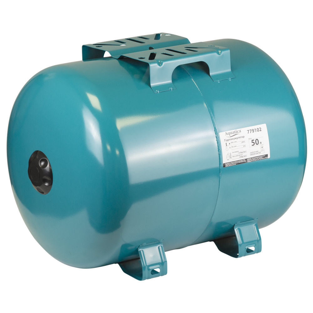 Гідроакумулятор Aquatica горизонтальний 50 л — надійний пристрій для підтримки оптимального тиску в системі водопостачання, запобігання гідравлічним ударам та зниження частоти вмикань перекачувального обладнання.