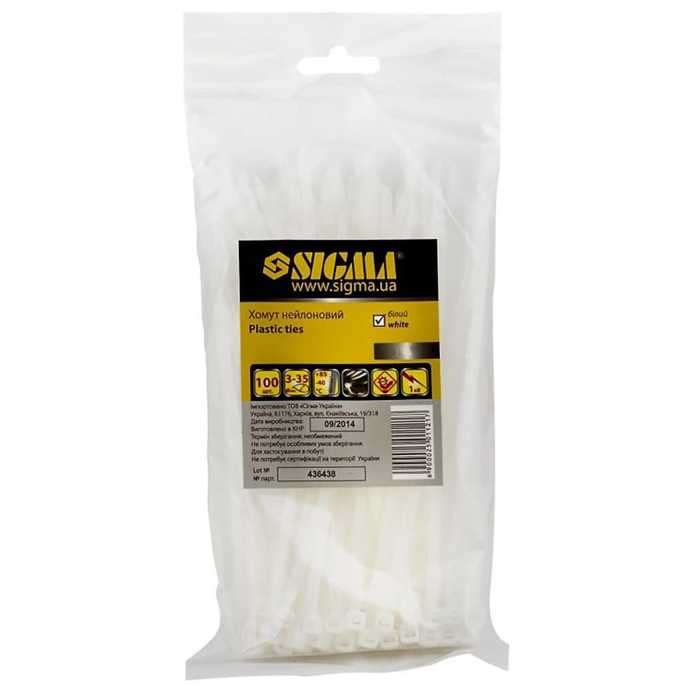 Хомут нейлон Sigma 7.9 x 350 мм 50 шт (білий) - надміцне кріплення для індустріального використання. Екстремальна ширина 7.9 мм дозволяє витримувати величезні навантаження на розрив, роблячи його незамінним у важкому будівництві.