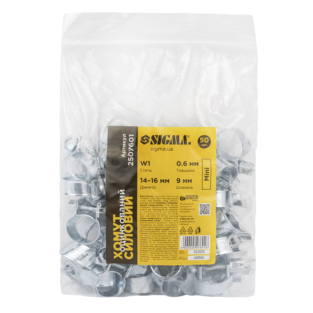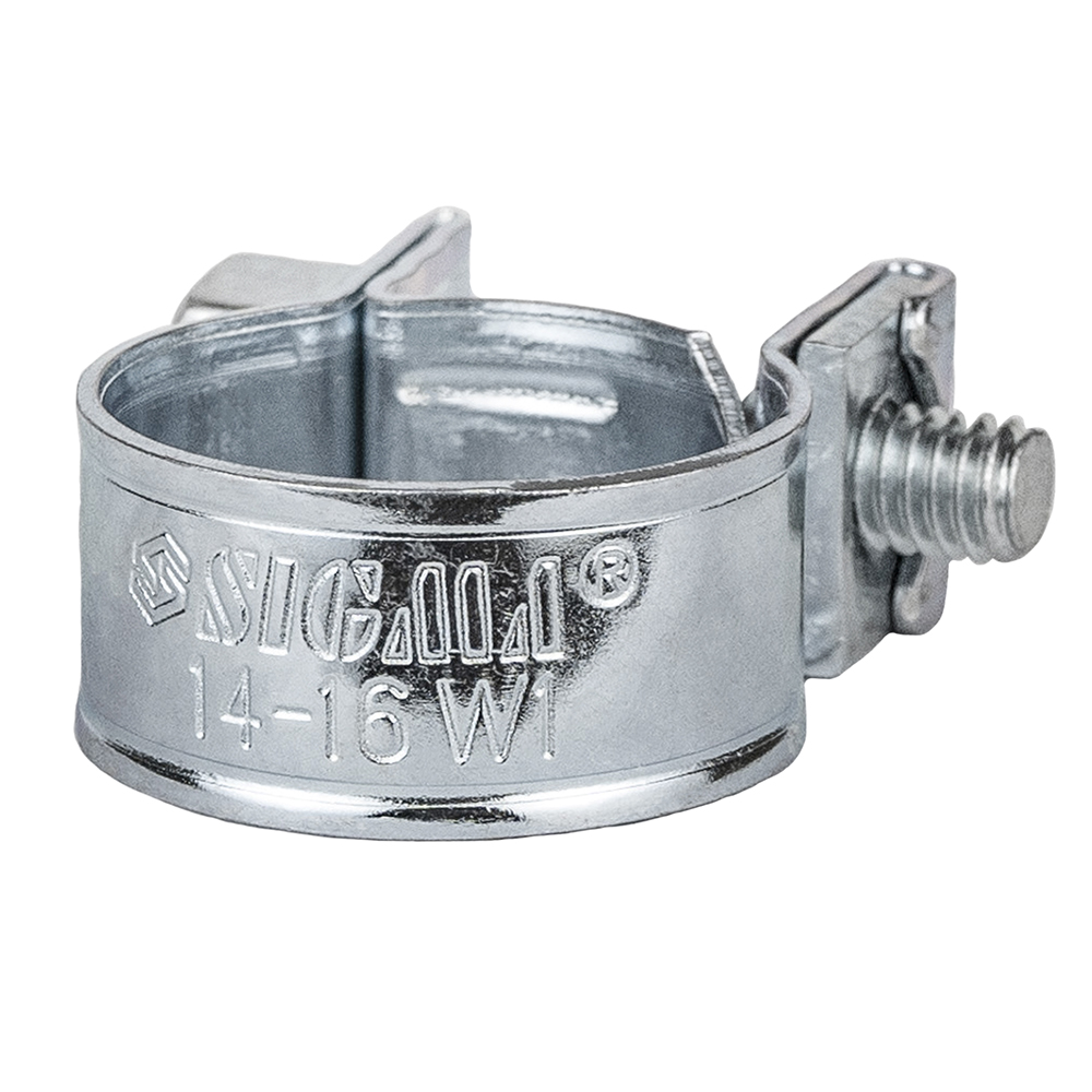 Хомут силовий Sigma оцинкований Mini 9 мм Ø14-16 мм 50 шт - технічний комплект затискних елементів для делікатних з'єднань. Гарантує надійність вузла без ризику прорізання шланга.