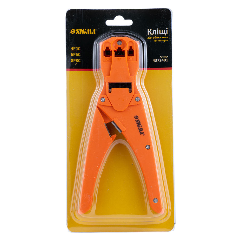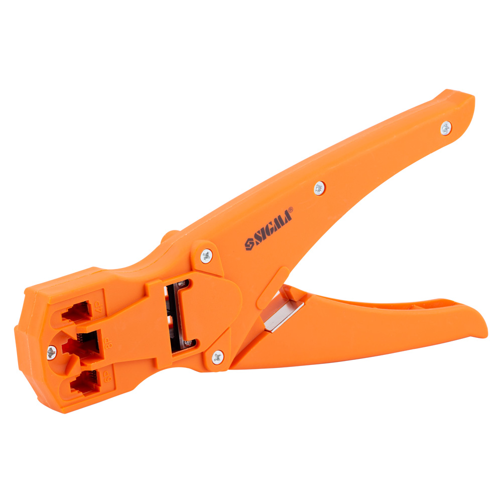 Кліщі для обтиску телекомунікаційних конекторів Sigma 4Р4С, 6Р6С, 8Р8С - це універсальний та легкий інструмент, призначений для обтиску основних типів конекторів (8p, 6p, 4p) при роботі з витою парою та телефонними кабелями. Ключовою особливістю цієї моделі є корпус з ударостійкого пластику, який забезпечує малу вагу (всього 0.240 кг) та зручність при тривалій експлуатації, знижуючи стомлюваність руки майстра. Вони є оптимальним вибором для фахівців, що займаються монтажем та обслуговуванням телекомунікаційних мереж.