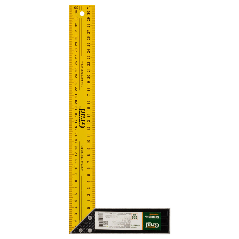 Косинець Grad сталевий 350 мм - це професійний вимірювальний та розмічальний інструмент збільшеного розміру, створений для точного розмічання та перевірки прямих кутів (90°) і кутів 45° під час складальних, столярних та будівельних робіт. Ключовою особливістю цієї моделі є надійне кріплення рукоятки до вимірювального полотна трьома заклепками, що забезпечує чудову жорсткість та запобігає розхитуванню. Пофарбована поверхня захищає пристосування від корозії, а чітка двостороння метрична шкала гарантує зручність та точність під час виконання розмічальних операцій.