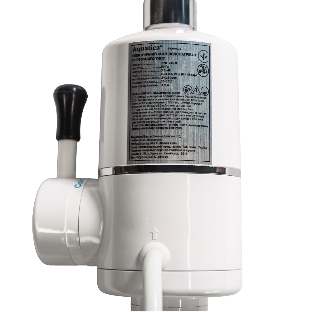 Безпека: завдяки вбудованому термостату прилад захищений від перегріву. Не перекривайте вихід води з виливу, коли пристрій працює в режимі нагрівання.