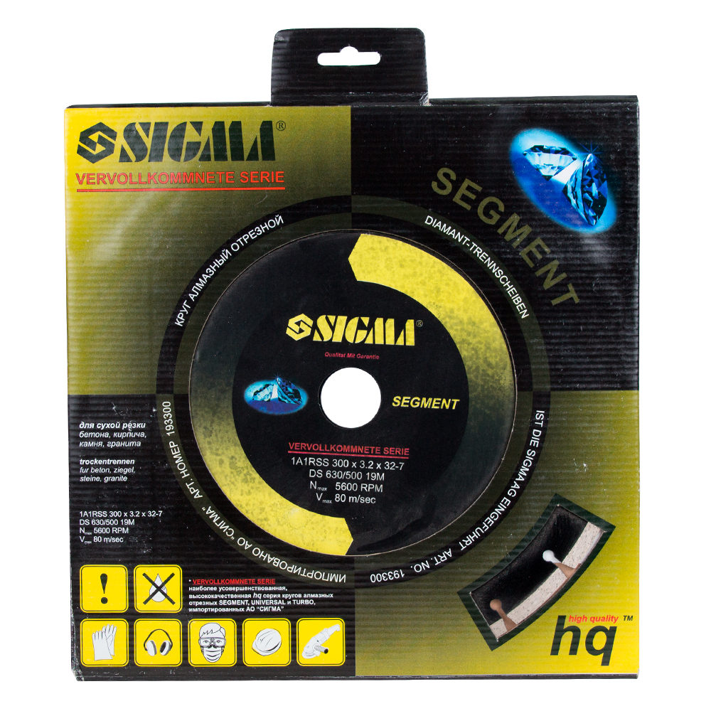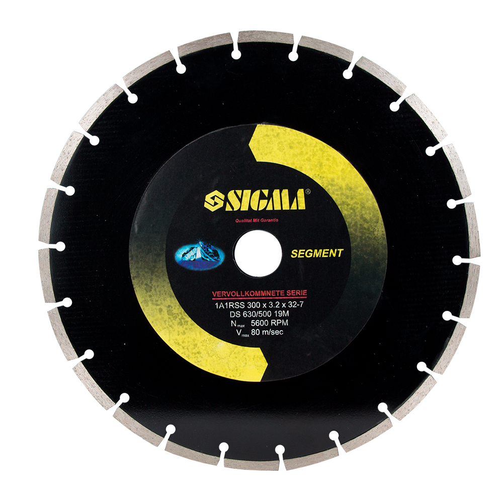 Круг алмазний Sigma HQ сегментний Ø300 x 32мм, 5600об/хв - це високопродуктивне професійне оснащення для стаціонарного обладнання та потужних КШМ, призначене для сухого різання твердих будівельних матеріалів. Оригінальна форма різальної крайки забезпечує швидке проходження матеріалу та ефективне відведення шламу без необхідності примусового охолодження.