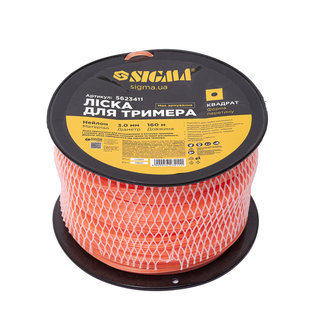 Ліска Sigma для тримера армований квадрат Ø3.0 мм 160 м котушка - оптимальний вибір для ландшафтних дизайнерів та професіоналів у сфері благоустрою. Профіль великого діаметру у поєднанні з армуванням забезпечує високу швидкість обробки ділянок зі складною рослинністю.