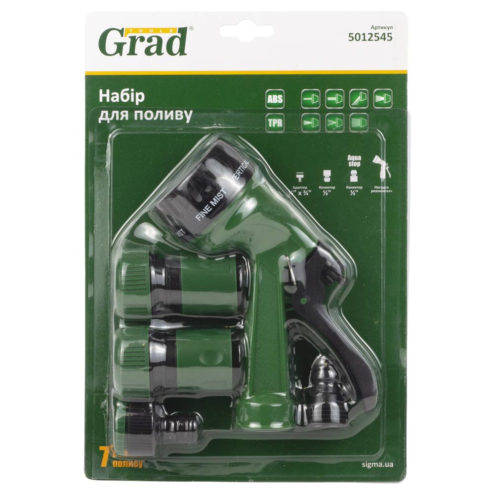Набір для поливу Grad пістолет-розпилювач 7 режимів, 2 конектори 3/4" + адаптер 1/2-3/4" (ABS) - потужний іригаційний комплект, оптимізований для роботи зі шлангами збільшеного діаметру. Сім режимів роботи дозволяють ефективно вирішувати будь-які завдання: від наповнення басейнів до дрібнодисперсного зволоження розсади.