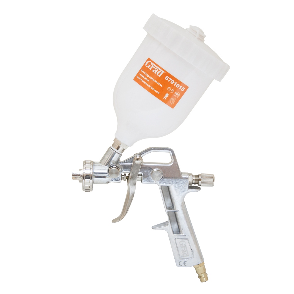 - Фарборозпилювач пневматичний: має верхнє розташування бачка, що гарантує стабільну подачу лакофарбового матеріалу та зручність при роботі з вертикальними поверхнями.