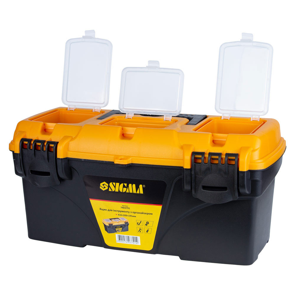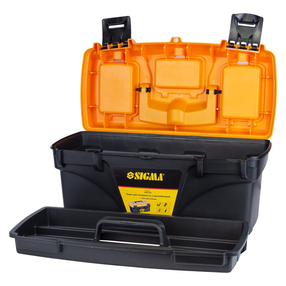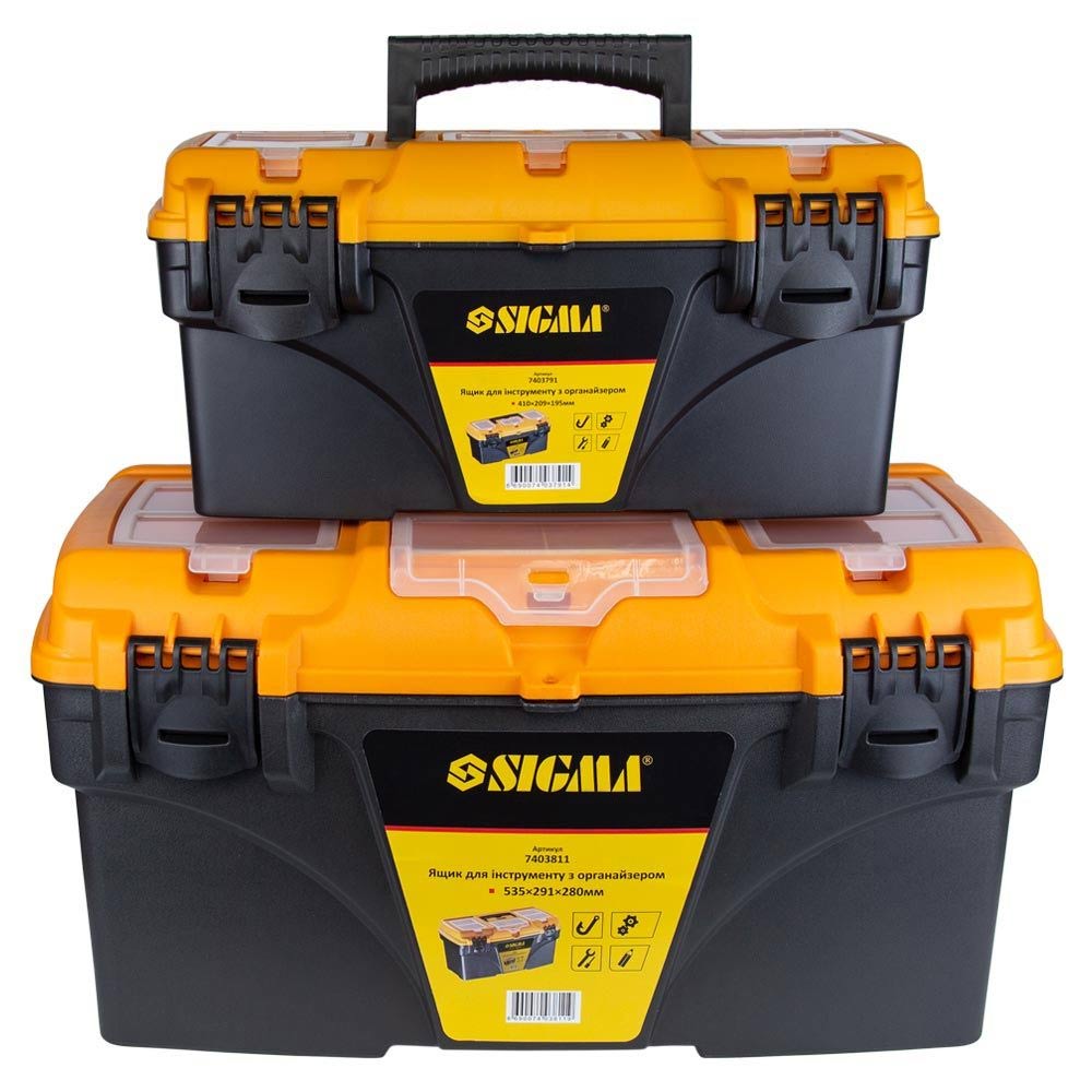 Набір ящиків для інструменту Sigma 2в1 з органайзером 410 x 209 x 195 мм, 535 x 291 x 280 мм - це універсальне рішення для впорядкування, безпечного зберігання та мобільності вашого робочого інвентарю. Завдяки наявності двох ємностей різних габаритів, комплект дозволяє систематизувати як масивне обладнання, так і дрібні деталі, забезпечуючи швидкий доступ до потрібних речей.