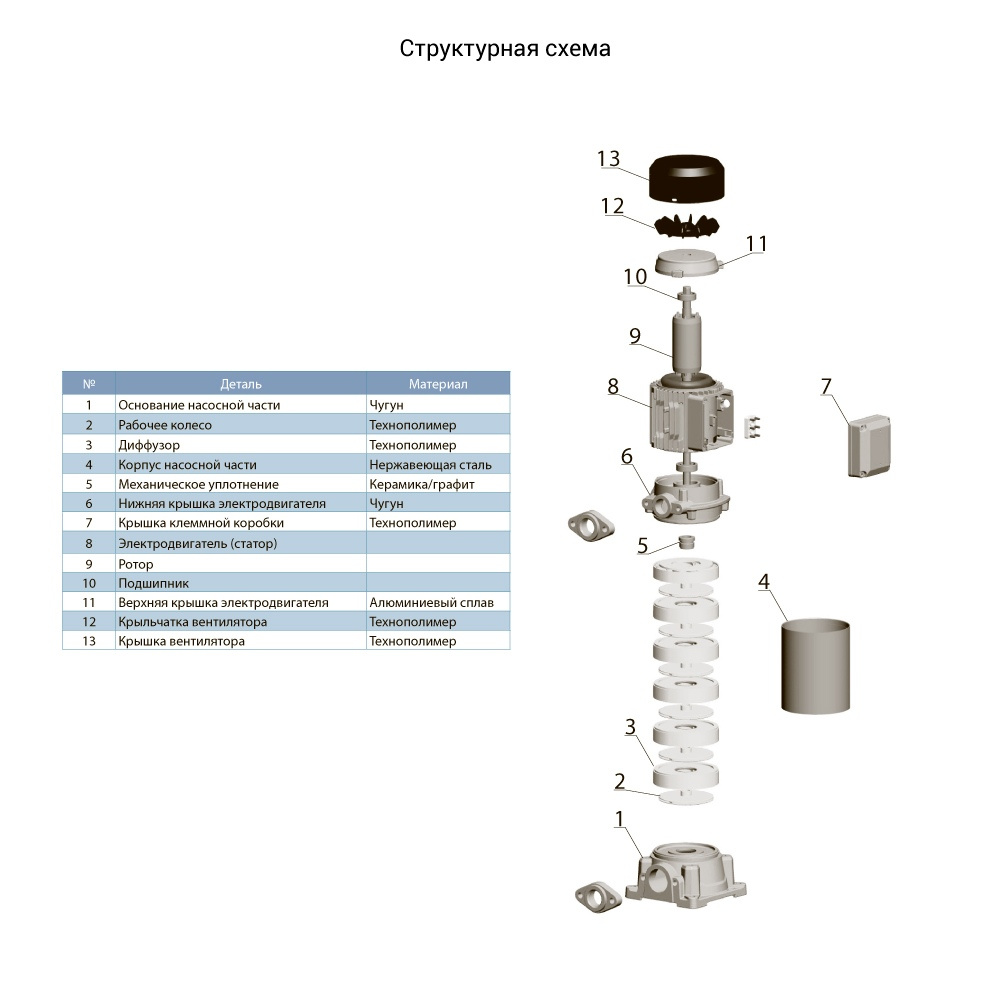 - робоче колесо: виготовлене з міцного технополімеру або нержавіючої сталі, що гарантує плавний потік рідини та зносостійкість.