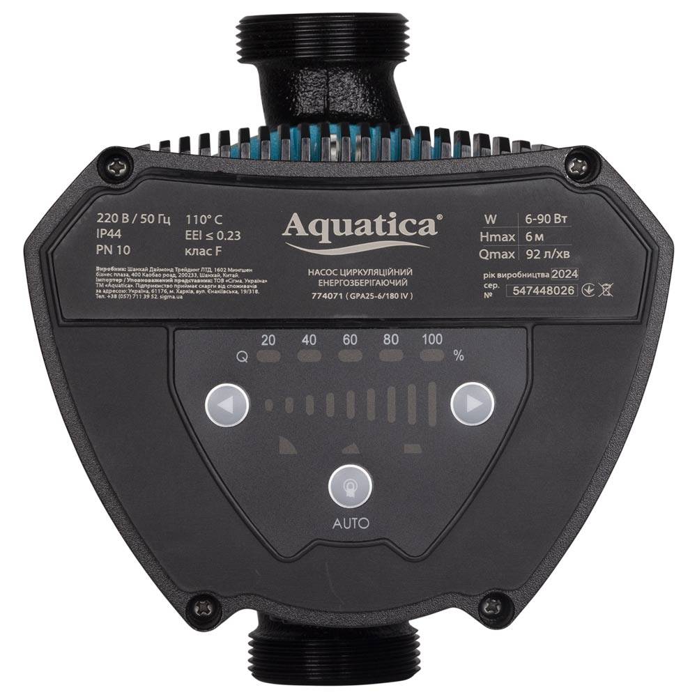 Насос циркуляційний Aquatica енергозберігаючий 6-90Вт Hmax 6м Qmax 92л/хв Ø1 1/2" 180 мм + гайки Ø1" GPA25-6/180 IV — це високотехнологічне обладнання, призначене для забезпечення примусового руху теплоносія у закритих та відкритих системах опалення. Дана модель оснащена сучасним електродвигуном із постійними магнітами та електронним блоком керування, що дозволяє автоматично адаптувати продуктивність під фактичні потреби системи. Завдяки вбудованому частотному перетворювачу агрегат відноситься до класу енергоефективності "А", суттєво знижуючи витрати на електроенергію порівняно зі стандартними аналогами. Пристрій відрізняється компактними габаритами з монтажною базою 180 мм, надзвичайно низьким рівнем шуму та високою надійністю всіх робочих вузлів.