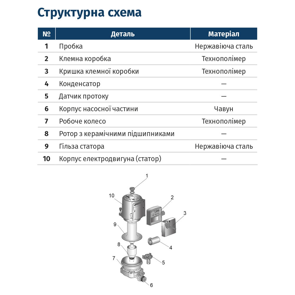 - Матеріал робочого колеса: технополімер