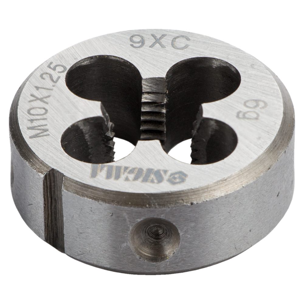 Плашка Sigma М10 x 1.25 мм - це високоякісна оснастка, призначена для нарізування або калібрування зовнішньої різьби з дрібним кроком. Даний виріб фіксується у спеціальних тримачах за допомогою стопорних гвинтів, для чого на його корпусі передбачені конічні заглиблення та кутовий паз. Завдяки високій жорсткості інструмент забезпечує формування профілю виняткової точності на деталях із різних матеріалів. Перед початком робіт робочу зону пристосування слід обробити консистентним мастилом для плавності ходу та захисту ріжучих крайок від передчасного зносу.
