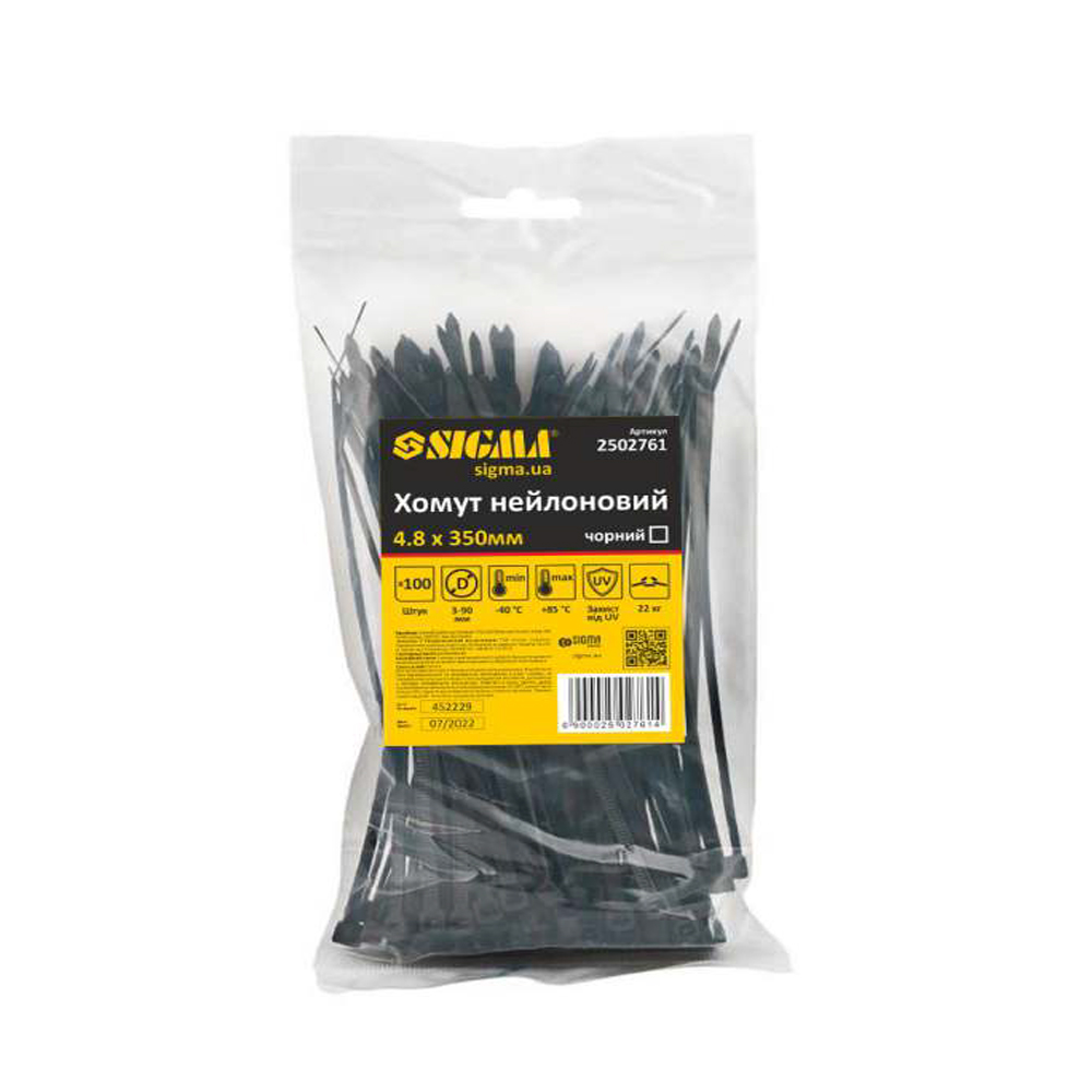 Хомут нейлон Sigma 4.8 x 400 мм 100 шт (черный) - это надежное средство для быстрого бандажирования электропроводов и фиксации кабелей к опорным конструкциям. Изделие изготовлено из полиамида 6.6, что гарантирует устойчивость к ультрафиолету и агрессивным химическим соединениям. Специальный замок одностороннего хода позволяет легко регулировать силу затяжки, обеспечивая прочное соединение труб или гибких шлангов.