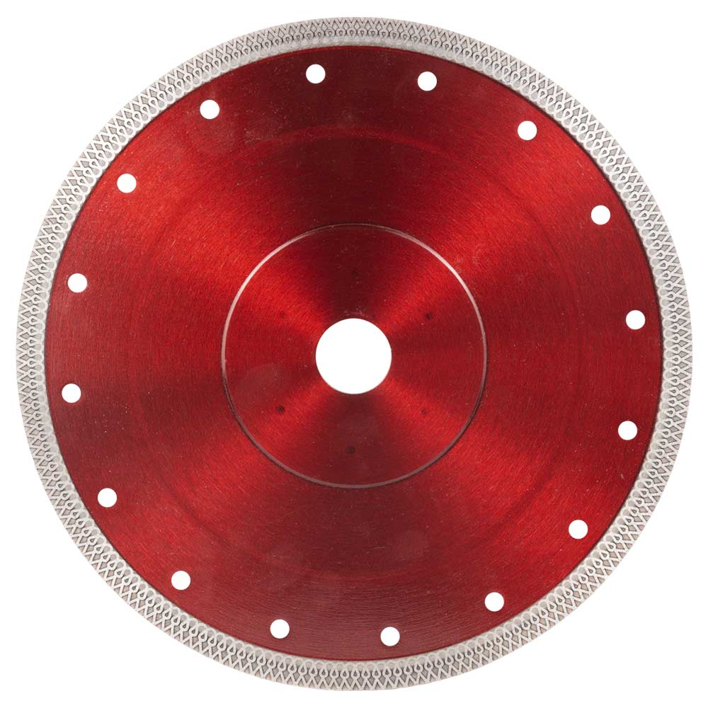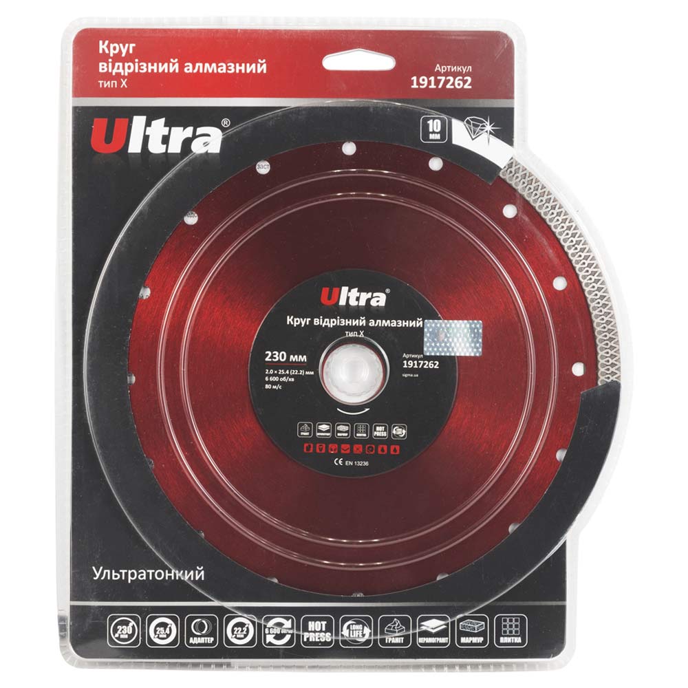 Круг отрезной алмазный Ultra тип Х Ø230 х 25.4 (22.2) мм – оснастка максимальной производительности для мощных УШМ 230 мм и плиткорезов, предназначенная для чистого и скоростного раскроя больших плит керамогранита и камня. Жесткий корпус с фланцем и ультратонкая Х-образная кромка обеспечивают непревзойденное качество реза на больших длинах.