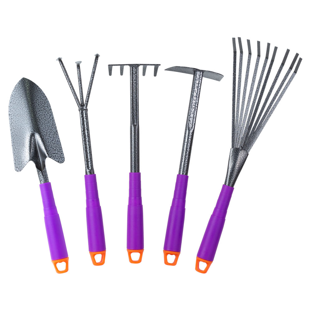 Полная комплектация: включает 5 ключевых инструментов (широкую лопатку, культиватор, 5-зубые грабли, плоскую мотыгу и веерные грабли) для всех видов садовых работ.
