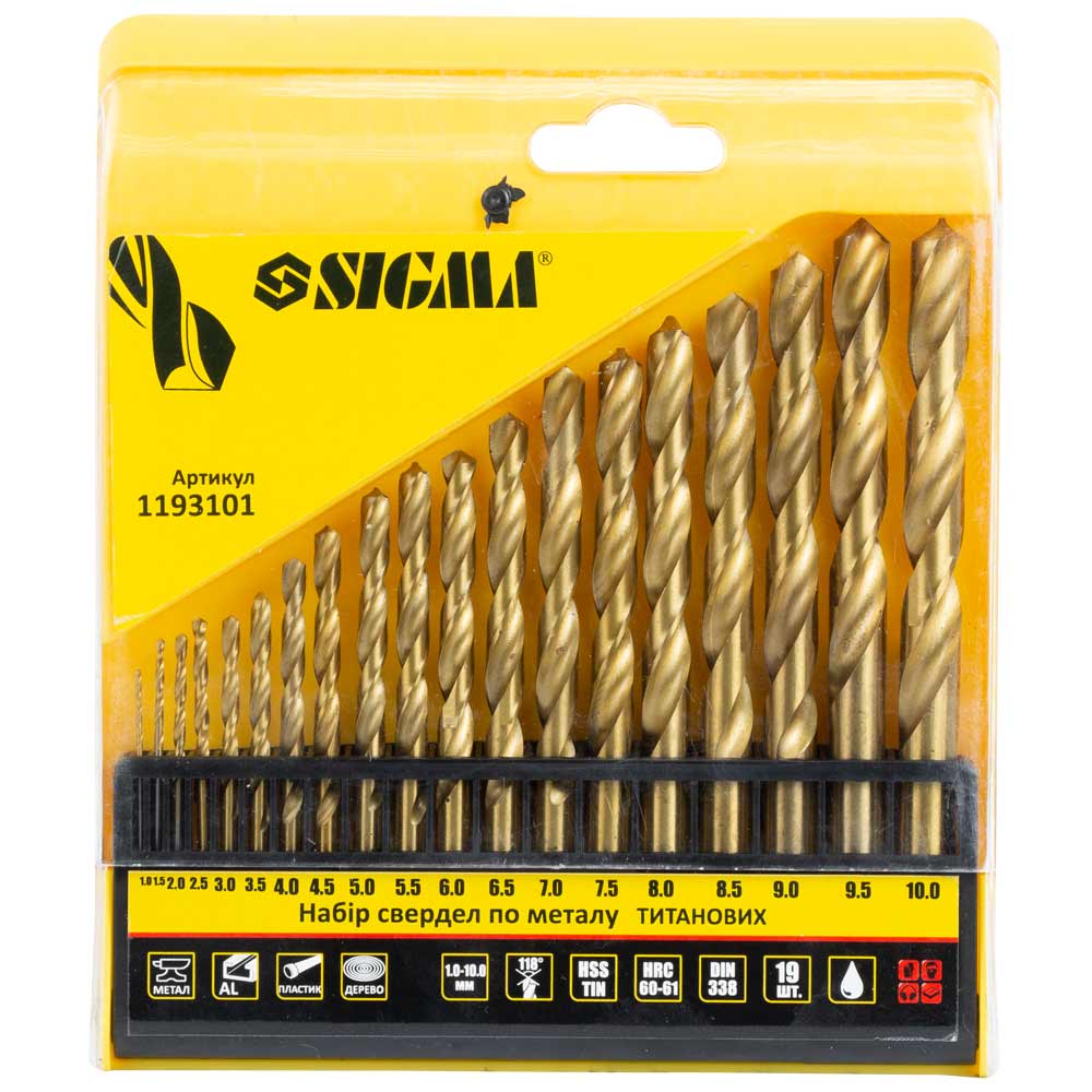 Набор сверл по металлу Sigma HSS-TIN титановых 19шт 1.0-10.0 мм (пластиковый кейс) - это надежное решение для создания качественных сквозных и глухих отверстий в деталях. Инструменты из стали HSS-TIN используются для прерывистого резания при невысоких нагрузках и предназначены для обработки легких металлов, стали, алюминия, пластика и древесины.