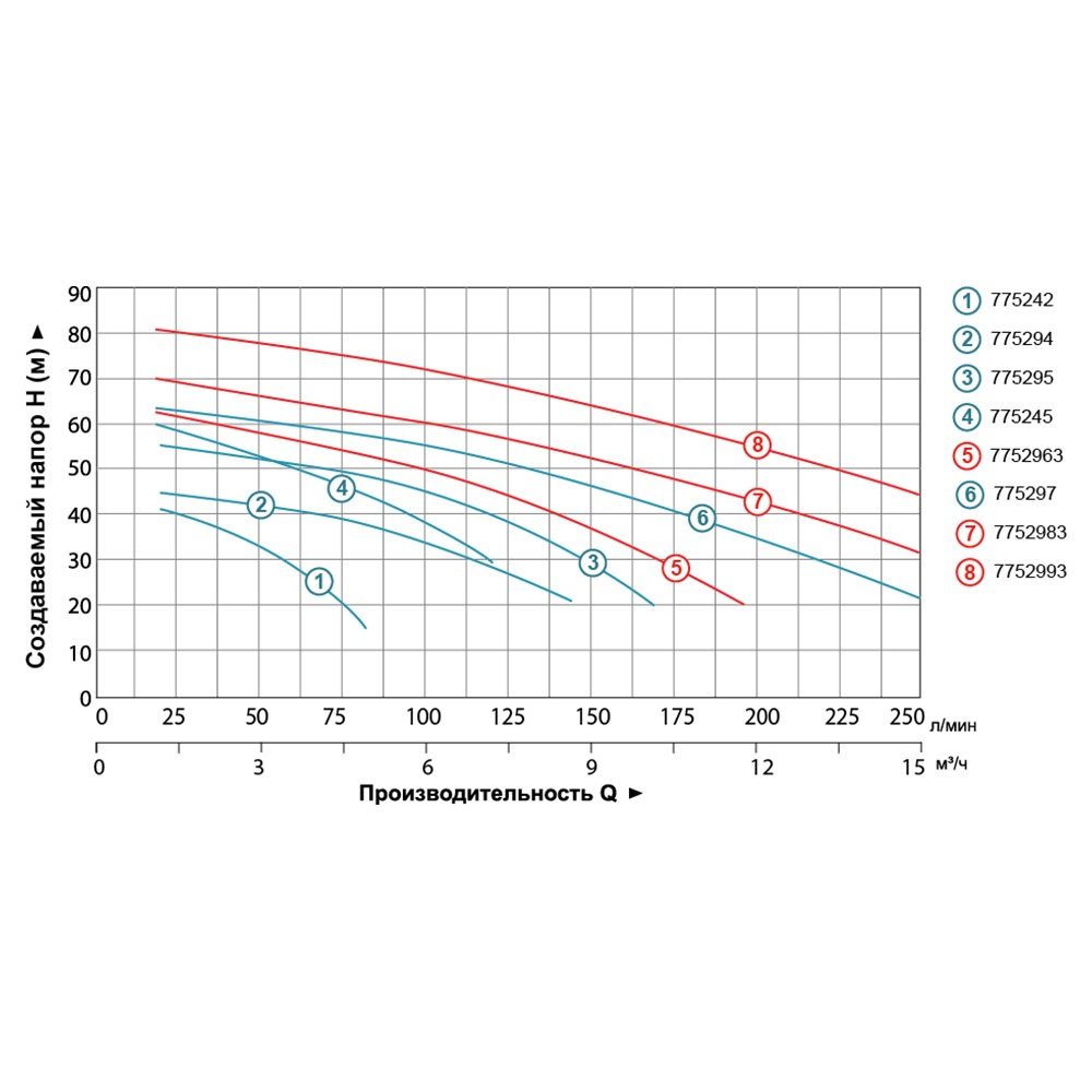- Максимальный напор (hmax): достигает 57.5 метров, что позволяет эффективно подавать воду на значительную высоту или большие расстояния
