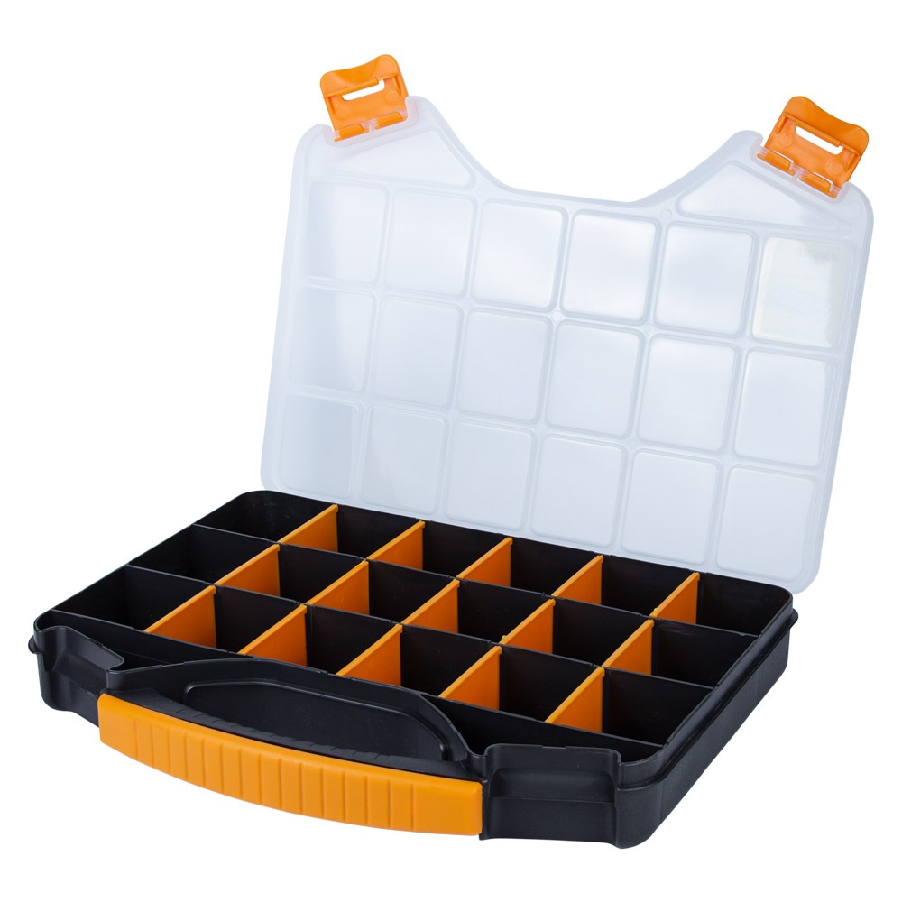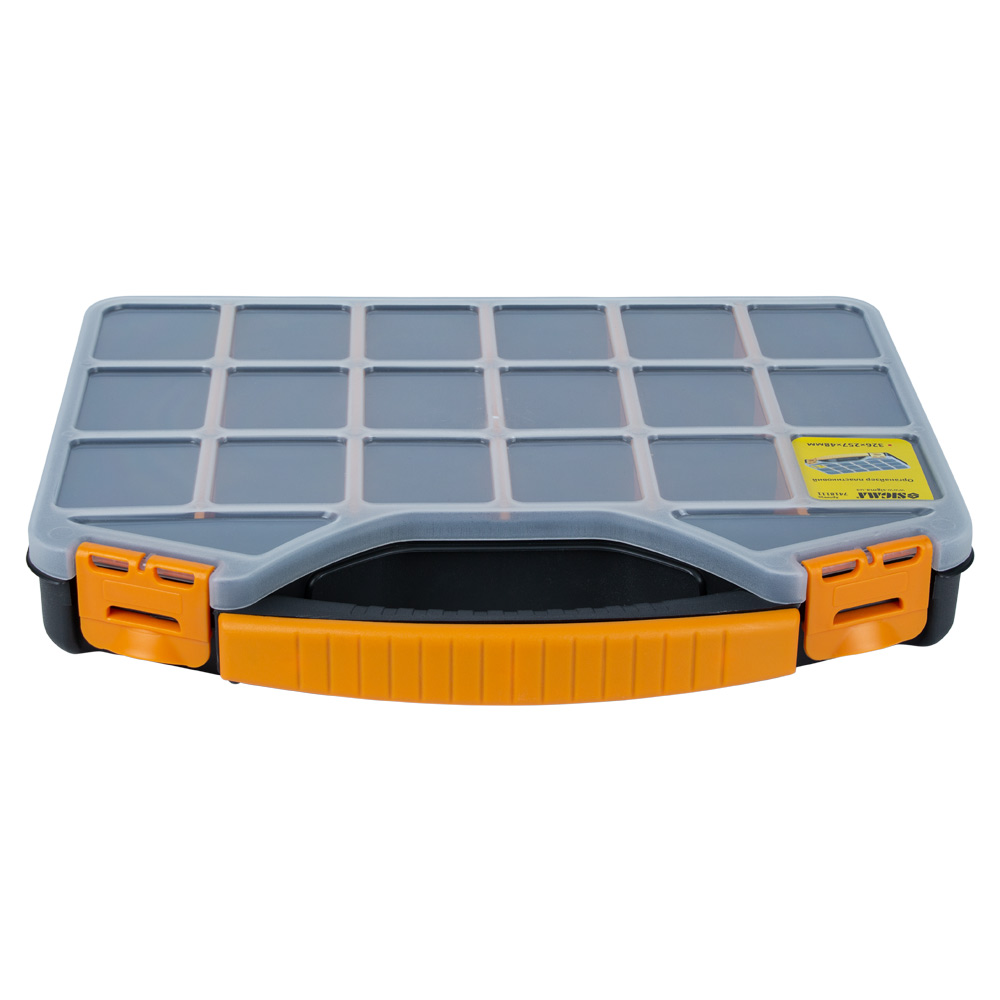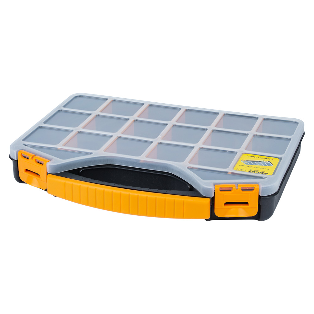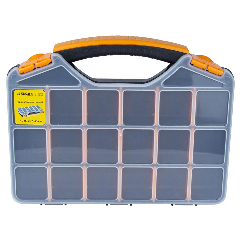 Органайзер Sigma пластиковый 326 x 257 x 48 мм предназначен для хранения, транспортировки, переноса и удобного доступа к мелкогабаритному инструменту. Помогают системно организовать хранение мелких деталей: крепежа, шайб, гаек и других мелочей. Простота в поиске необходимых деталей обеспечивается наличием нескольких секций.