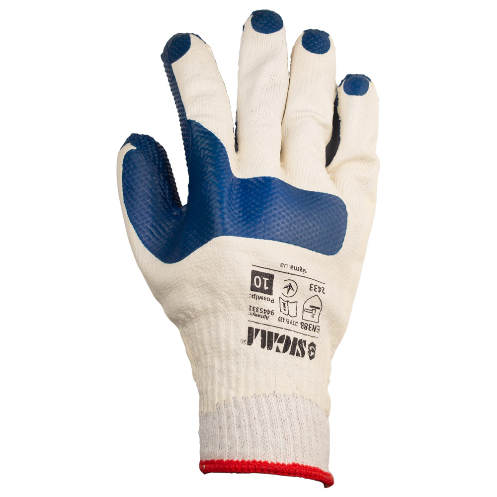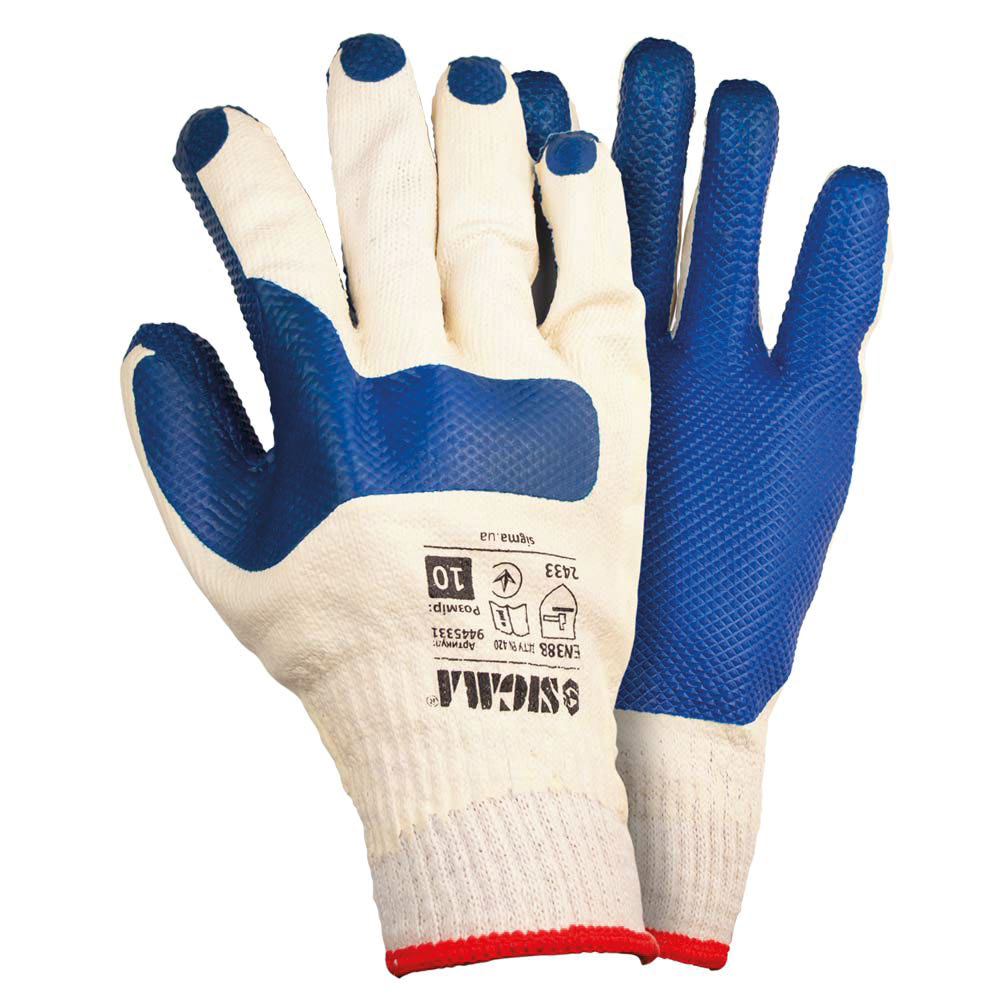 Перчатки Sigma трикотажные стекольщика с двойным латексным покрытием усиленные р10 (синие, манжет)