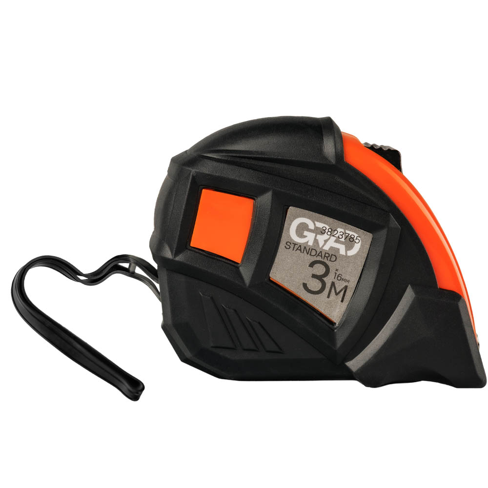 Рулетка Grad Standard магнітна обгумована автостоп 3 м х 16 мм - це портативний вимірювальний інструмент, призначений для точного визначення лінійних розмірів та відстаней у побуті, будівництві та на виробництві. Корпус даної моделі виконаний з ударостійкого ABS-пластику та доповнений гумовим покриттям TPR, яке забезпечує надійне зчеплення з рукою та захищає від пошкоджень при падінні. Ключовою особливістю є стійке металеве полотно з чіткою метричною шкалою та магнітним зачепом, що надійно фіксується на металевих поверхнях. Додаткові кнопки блокування дозволяють утримувати полотно в будь-якому зручному положенні, а кріплення на пояс та прогумований ремінець на руку підвищують зручність використання. Клас точності вимірювання MID II гарантує високу достовірність показань.