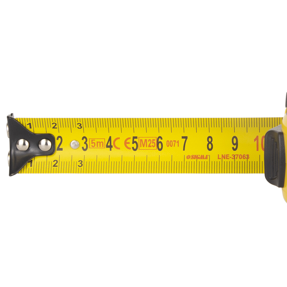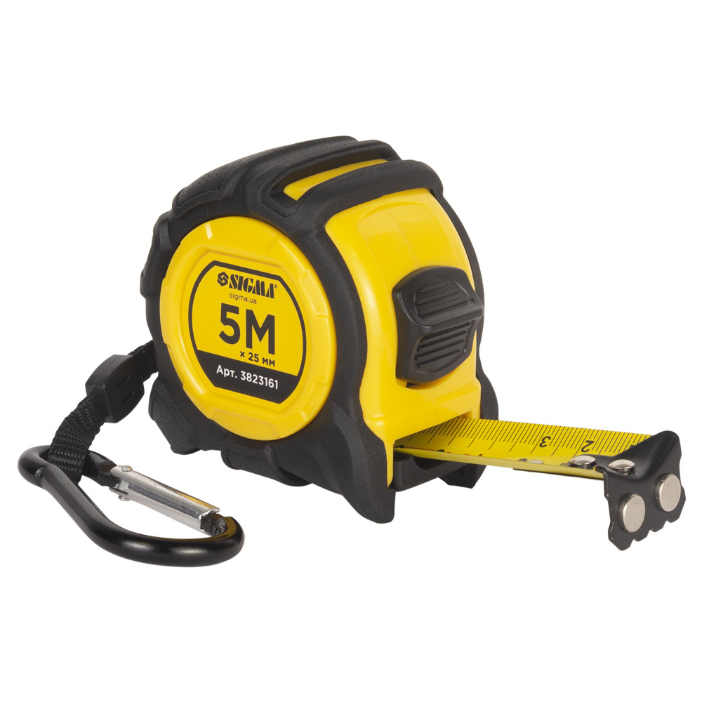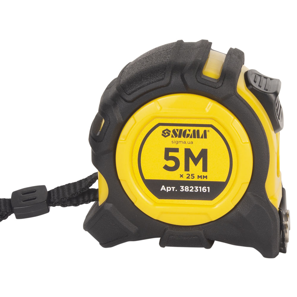 Рулетка Sigma Advanced магнітна обгумована нейлонове покриття 5 м х 25 мм - це надійний та високопродуктивний вимірювальний інструмент, створений для інтенсивного використання та виконання складних завдань. Корпус виконаний з ударостійкого ABS пластику та повністю покритий прогумованим TPR матеріалом, що забезпечує виняткову ергономіку, запобігаючи випадковому вислизанню та ефективно гасячи удари при падінні. Ключовою особливістю є широке сталеве полотно 25 мм з нейлоновим покриттям, яке має підвищену зносостійкість, захищено від заламувань, корозії та витримує часті вигини. Магнітний зачіп значно спрощує роботу з металевими конструкціями, а клас точності вимірювання II гарантує високу достовірність показань.