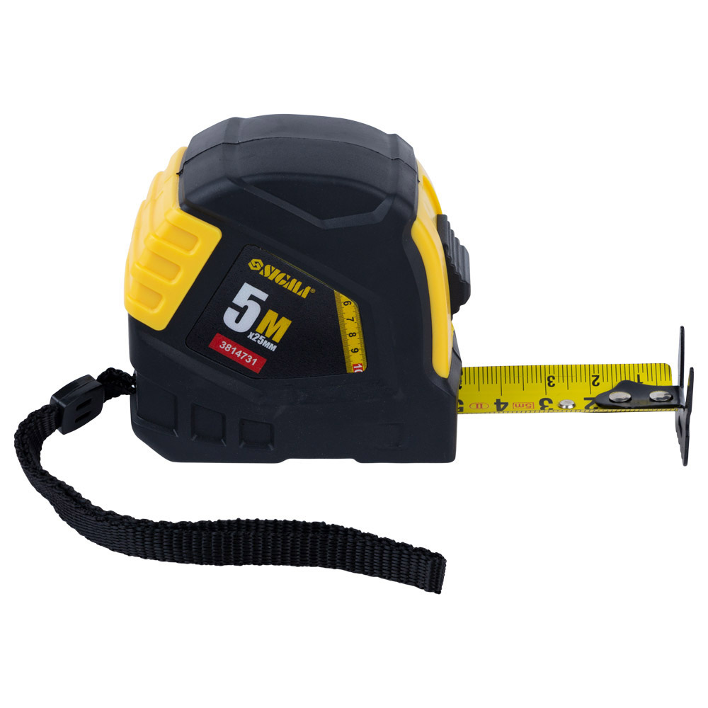 Рулетка Sigma обрезинена 5 м х 25 мм - це ергономічний вимірювальний пристрій, корпус якого виготовлений з ударостійкого АБС-пластику та є частково обрезиненим. Двосторонній рухомий зачіп, посилений двома заклепками, дозволяє виконувати вимірювання, чіпляючи або притуляючи полотно. Цей механізм оснащений сталевою стрічкою з двосторонньою метричною шкалою. Спеціальний отвір на зачепі призначений для фіксації за шуруп або цвях, а отвір на стрічці дозволяє використовувати агрегат як циркуль для малювання кіл. Також модель укомплектована поясним затискачем та ремінцем для руки.