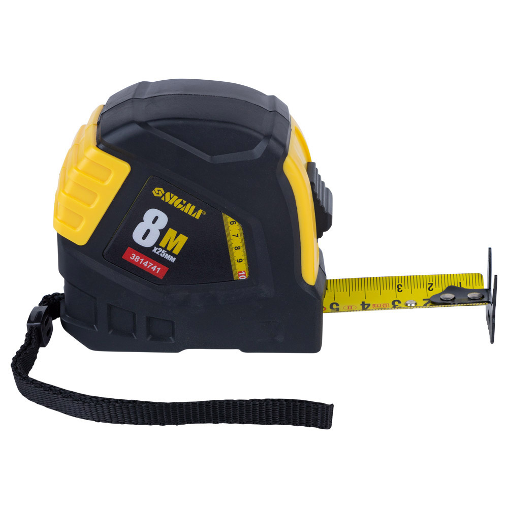 Рулетка обгумована 8 м х 25 мм Sigma - це функціональний вимірювальний пристрій, розроблений для виконання робіт на великих дистанціях. Корпус моделі виконаний з ударостійкого АБС-пластику з гумовим покриттям, що забезпечує комфортний хват та захист при падінні. Сталева стрічка оснащена двосторонньою метричною шкалою для зручності зчитування показань, а спеціальний зачіп з отворами дозволяє фіксувати край за елементи кріплення або використовувати інструмент як циркуль для малювання кіл.