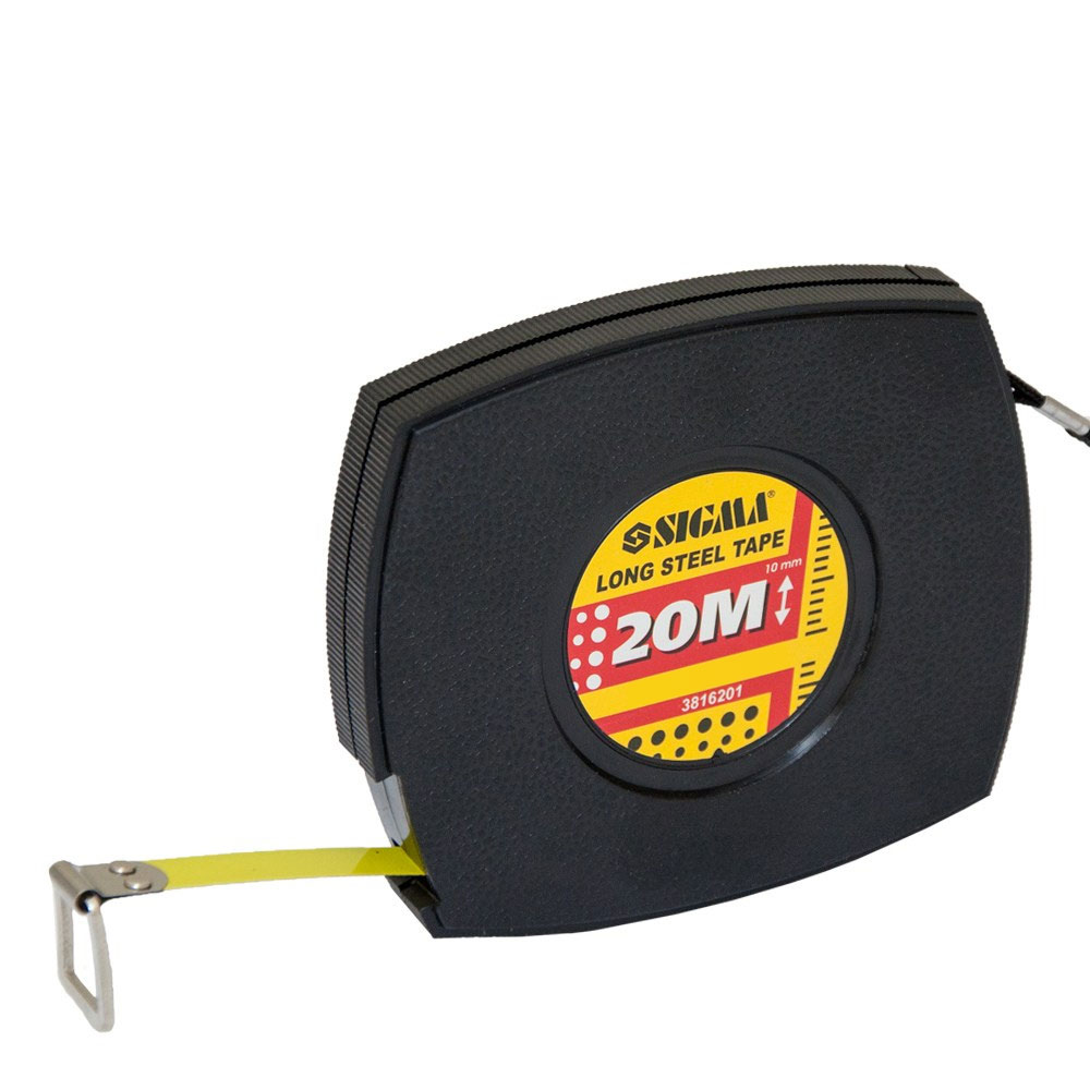 Рулетка Sigma сталева стрічка 20 м х 10 мм (чорна) - це високоточний інструмент для виконання лінійних вимірювань на великих відстанях. Корпус даної моделі закритого типу виготовлений з міцного полікарбонату, що забезпечує надійний захист механізму від зовнішніх впливів та пилу. Ключовою особливістю є сталеве полотно шириною 10 мм, оснащене чіткою метричною шкалою. Для зручності використання передбачений відкидний важіль, який значно полегшує процес змотування стрічки після вимірювання, а ремінець на руку забезпечує комфорт при перенесенні.