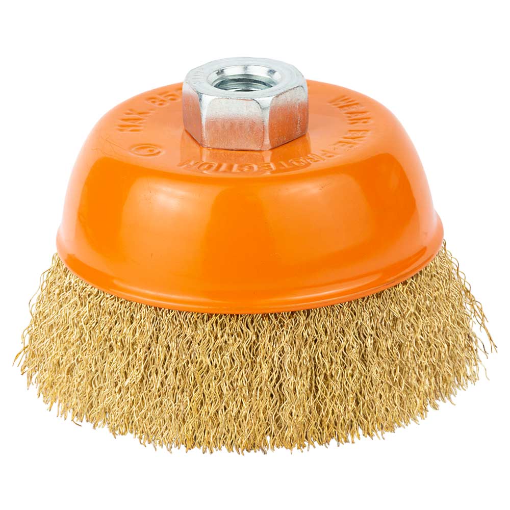 Щітка дротяна Grad чашоподібна Ø100 мм М14 х 2 мм (латунована) – високопродуктивна насадка для болгарки, створена для швидкого та щадного зачищення великих площ. Гофрований дріт м'яко обробляє поверхню, ефективно видаляючи застарілі лакофарбові покриття та іржу з великих металоконструкцій.