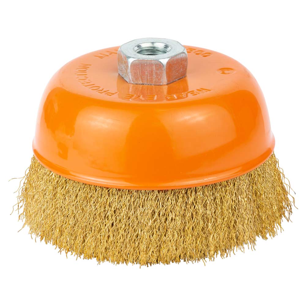 Щітка дротяна Grad чашоподібна Ø125 мм М14 х 2 мм (латунована) – найпотужніша насадка в серії для КШМ, призначена для виконання масштабних зачисних робіт зі щадним ефектом. Максимальний діаметр та гофрований дріт забезпечують неперевершену продуктивність при делікатному видаленні нашарувань з дуже великих поверхонь.