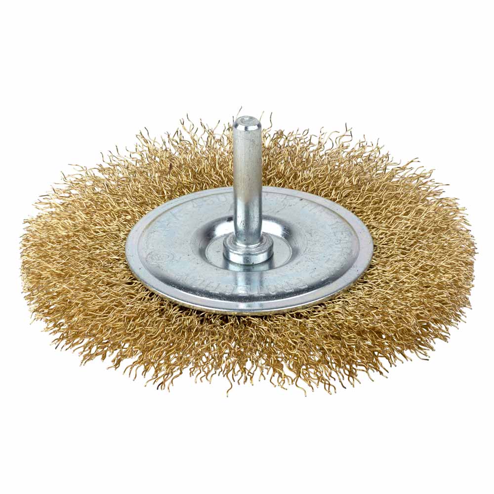 Щітка дротяна Grad дископодібна Ø100 мм хвостовик Ø6 мм (латунована) – це найпродуктивніша дископодібна насадка для дриля, призначена для щадного зачищення крайок та пазів на великих поверхнях. Вона ефективно видаляє нашарування, не пошкоджуючи основний матеріал завдяки гофрованій структурі дроту.