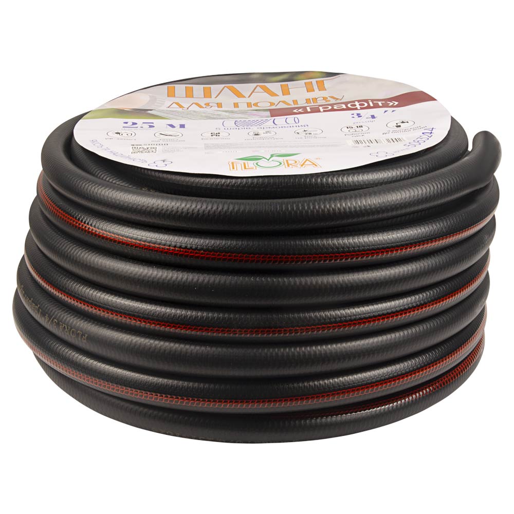 Шланг для поливу Flora Графіт 5 шарів армований 3/4" 25 м - гнучка трубка, призначена подавати рідину до присадибних ділянок, городів та садів. Садовий інвентар сумісний із більшістю сучасних розпилювачів та дощувачів, що дозволяє легко організувати систему зрошення грунту або помити автомобіль.