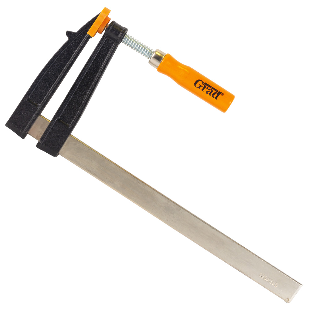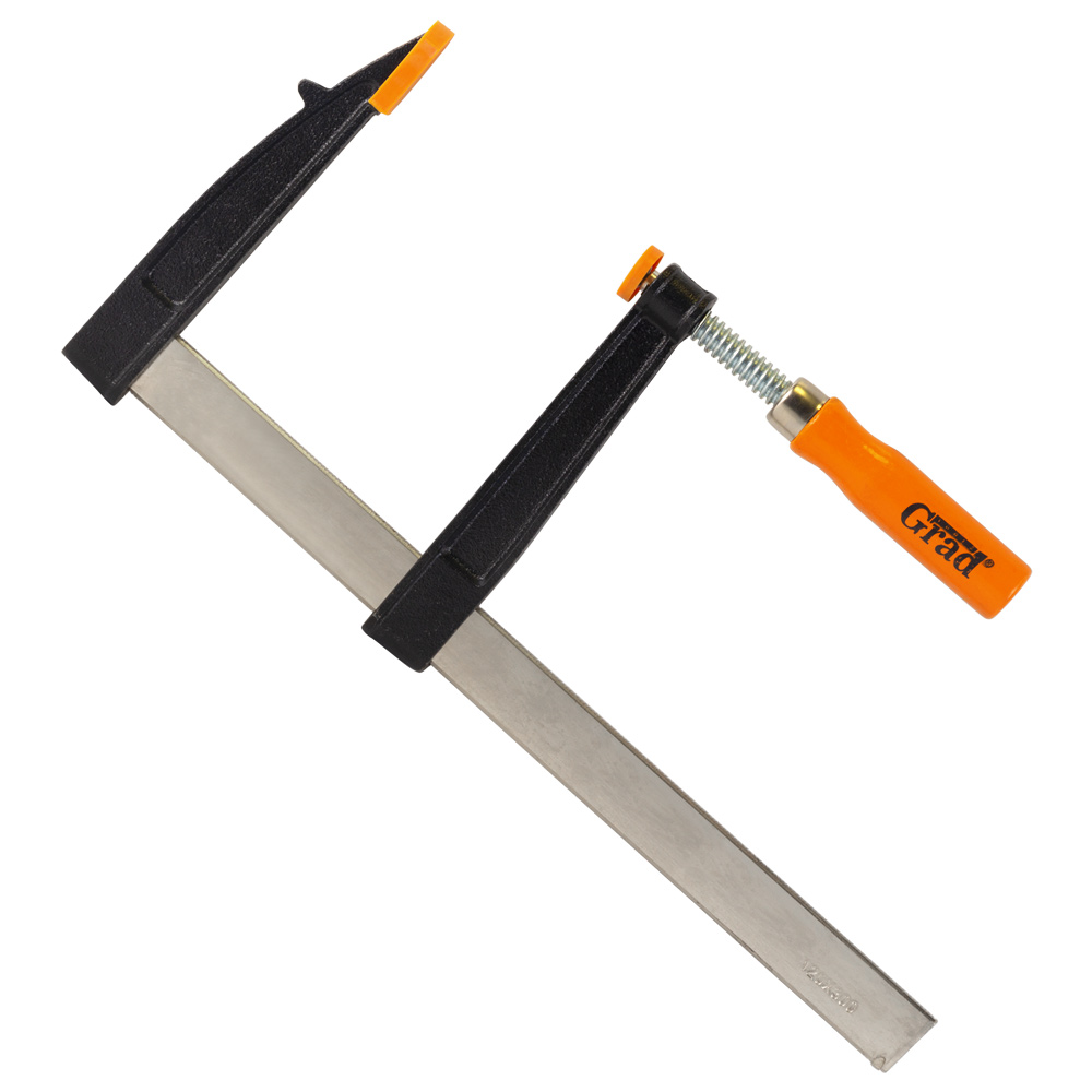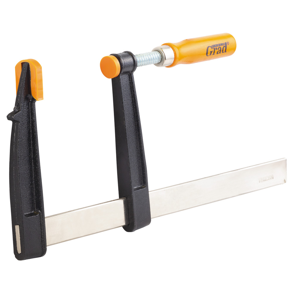 Струбцина столярна Grad тип F 300 х 120 мм - це потужний та універсальний інструмент, призначений для фіксації широких заготовок та деталей. Ключовою особливістю цієї моделі є її збільшена глибина затиску (120 мм), яка дозволяє надійно фіксувати широкі дошки, стільниці та інші габаритні елементи. Знімні пластикові накладки на робочих поверхнях захищають матеріал від пошкоджень, а міцна основа з чавуну та гвинтовий притиск забезпечують потужний та надійний затиск.