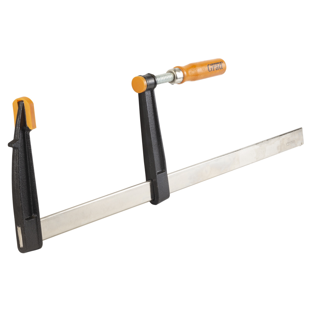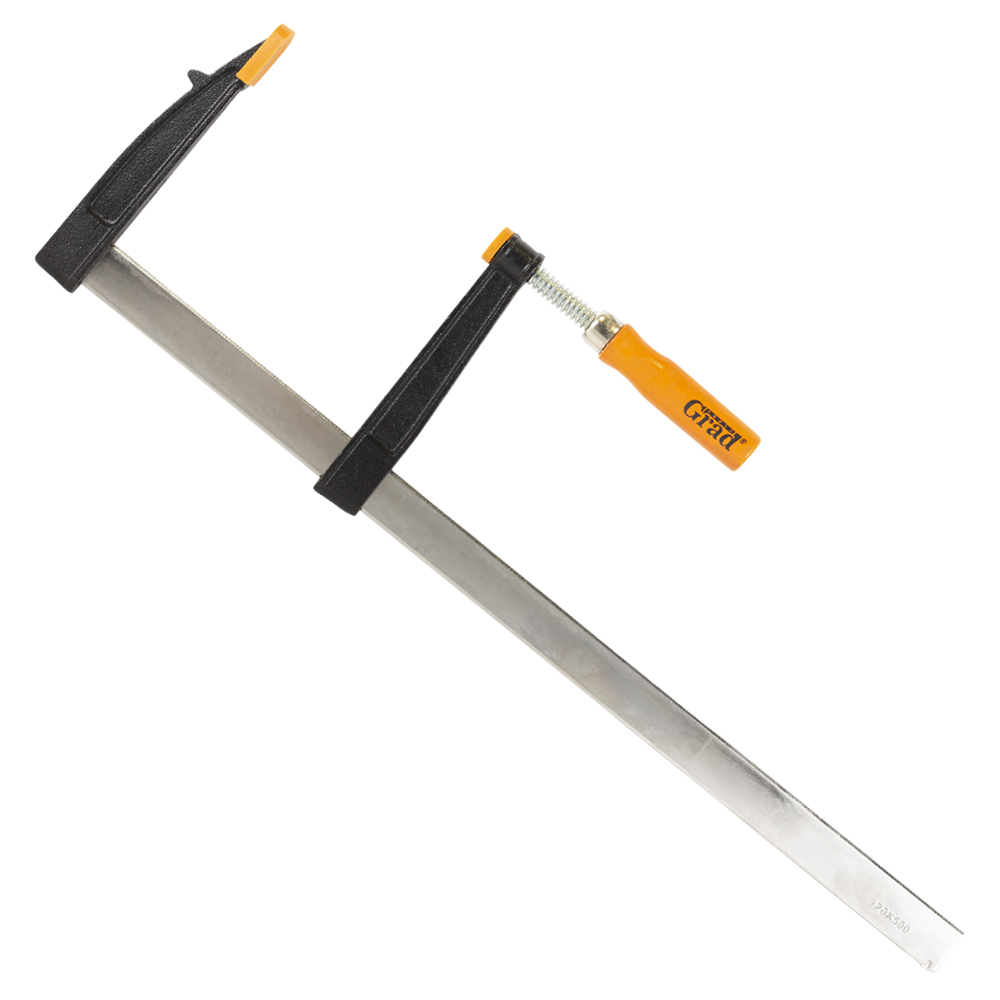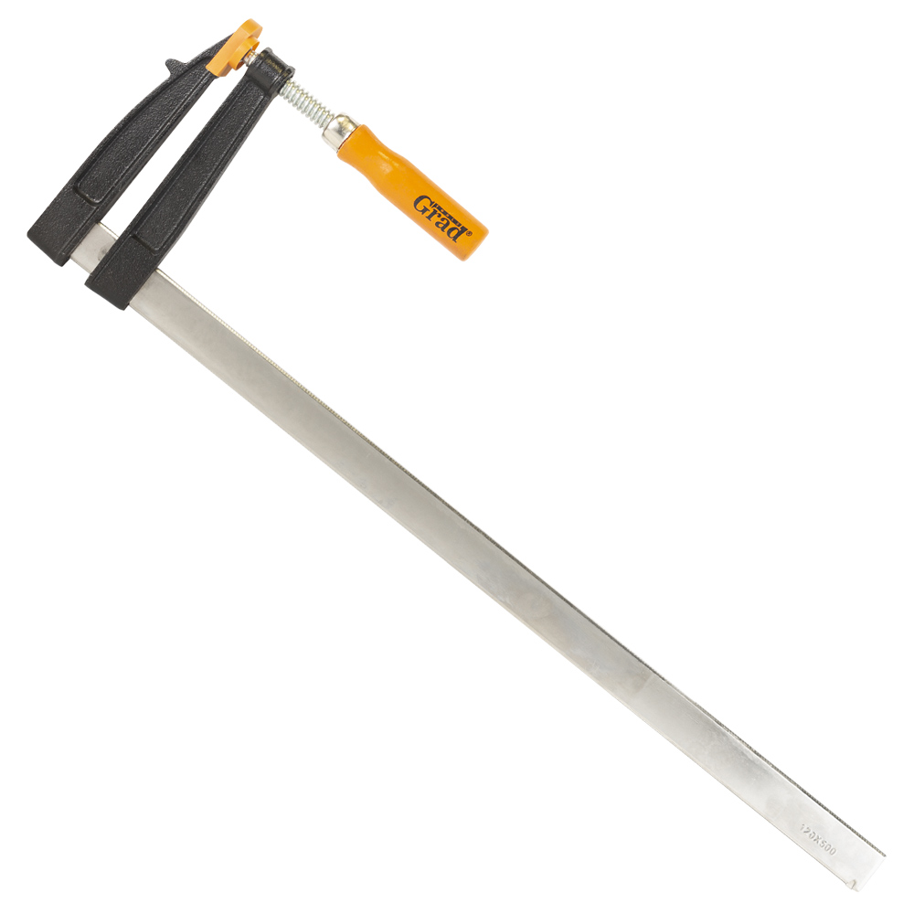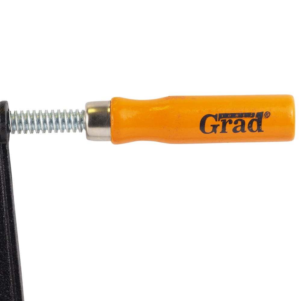 Струбцина столярна Grad тип F 500 х 120 мм - це універсальний силовий інструмент, призначений для складання меблів, фіксації стільниць та роботи з іншими заготовками середнього та великого розміру. Головною перевагою цього продукту є його збалансований розмір, що поєднує достатню довжину (500 мм) зі збільшеною глибиною затиску (120 мм). Знімні пластикові накладки на робочих поверхнях захищають делікатні матеріали від пошкоджень, а міцна конструкція з чавуну забезпечує надійну фіксацію.