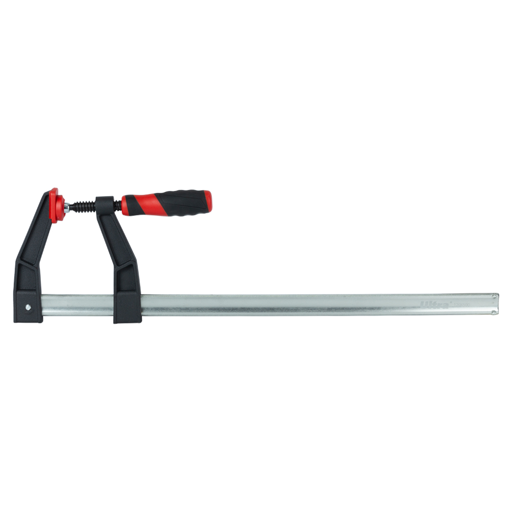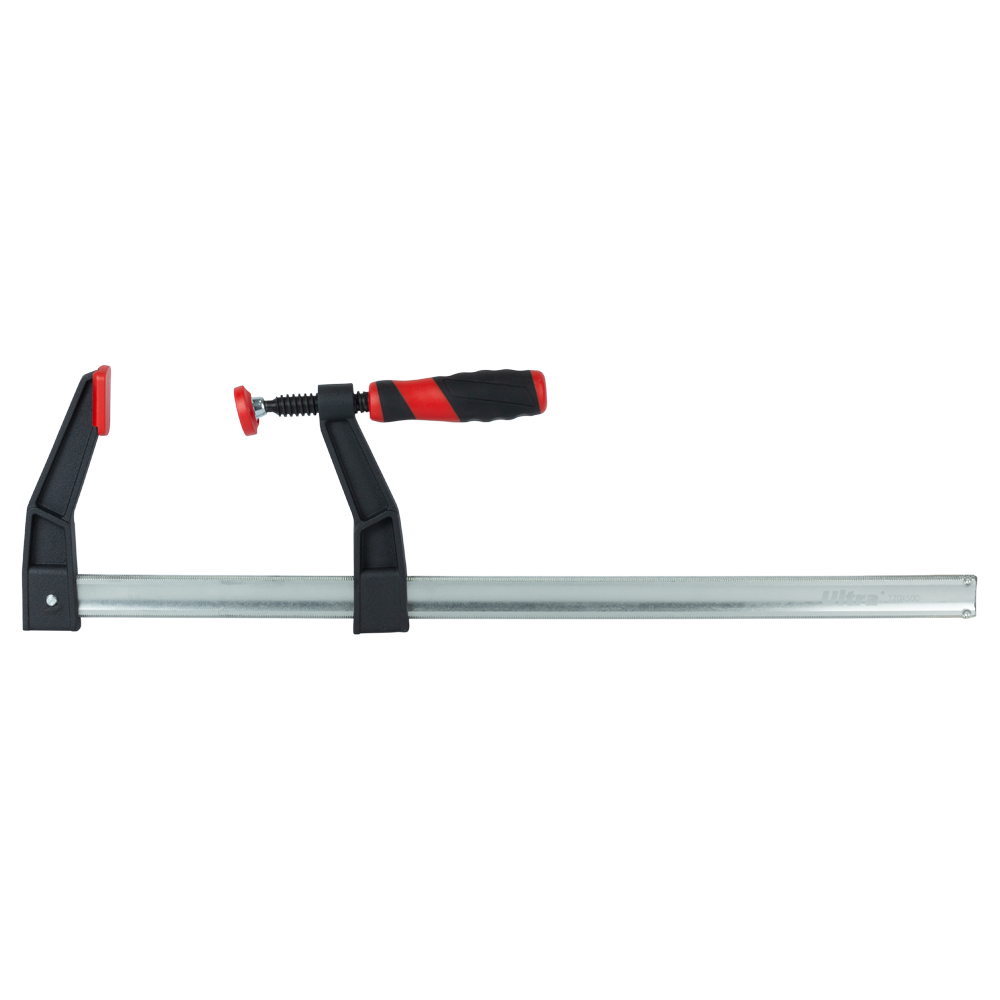 Струбцина столярна Ultra тип F 500 х 120 мм DIN 5117 посилена - це потужний силовий інструмент, призначений для складання меблів, фіксації стільниць та роботи з іншими великогабаритними заготовками. Головною перевагою цього продукту є його велика довжина затиску (500 мм) у поєднанні зі збільшеною глибиною (120 мм) та посиленою конструкцією, що витримує до 200 кг. Знімні пластикові накладки захищають делікатні матеріали від пошкоджень, а ергономічна рукоятка забезпечує комфорт при роботі з високими навантаженнями.