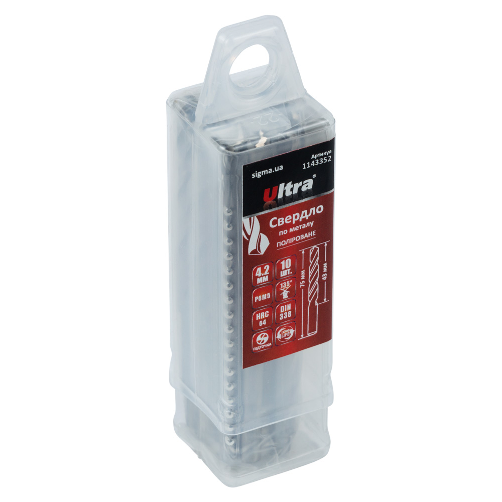 Свердло по металу Ultra Р6М5 поліроване Ø4.2 мм (тубус КРАТНО 10 шт) - це високоточний інструмент, основним завданням якого є підготовка отворів під нарізання метричної різьби М5. Головною перевагою цього продукту є його сталь Р6М5, яка гарантує збільшений ресурс та зносостійкість при серійній роботі з легованими та вуглецевими сталями. Підточування вістря (кут 135°) забезпечує точне центрування та акуратне свердління без використання кернера.