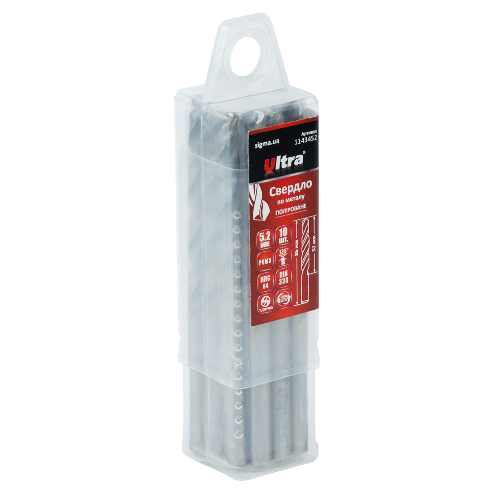 Свердло по металу Ultra Р6М5 поліроване Ø5.2 мм (тубус КРАТНО 10 шт) - це високоточний інструмент, основним завданням якого є підготовка отворів під нарізання метричної різьби М6. Головною перевагою цього продукту є його професійна сталь Р6М5, яка гарантує збільшений ресурс та зносостійкість при серійній роботі з легованими та вуглецевими сталями. Підточування вістря (кут 135°) забезпечує точне центрування та акуратне свердління без використання кернера.