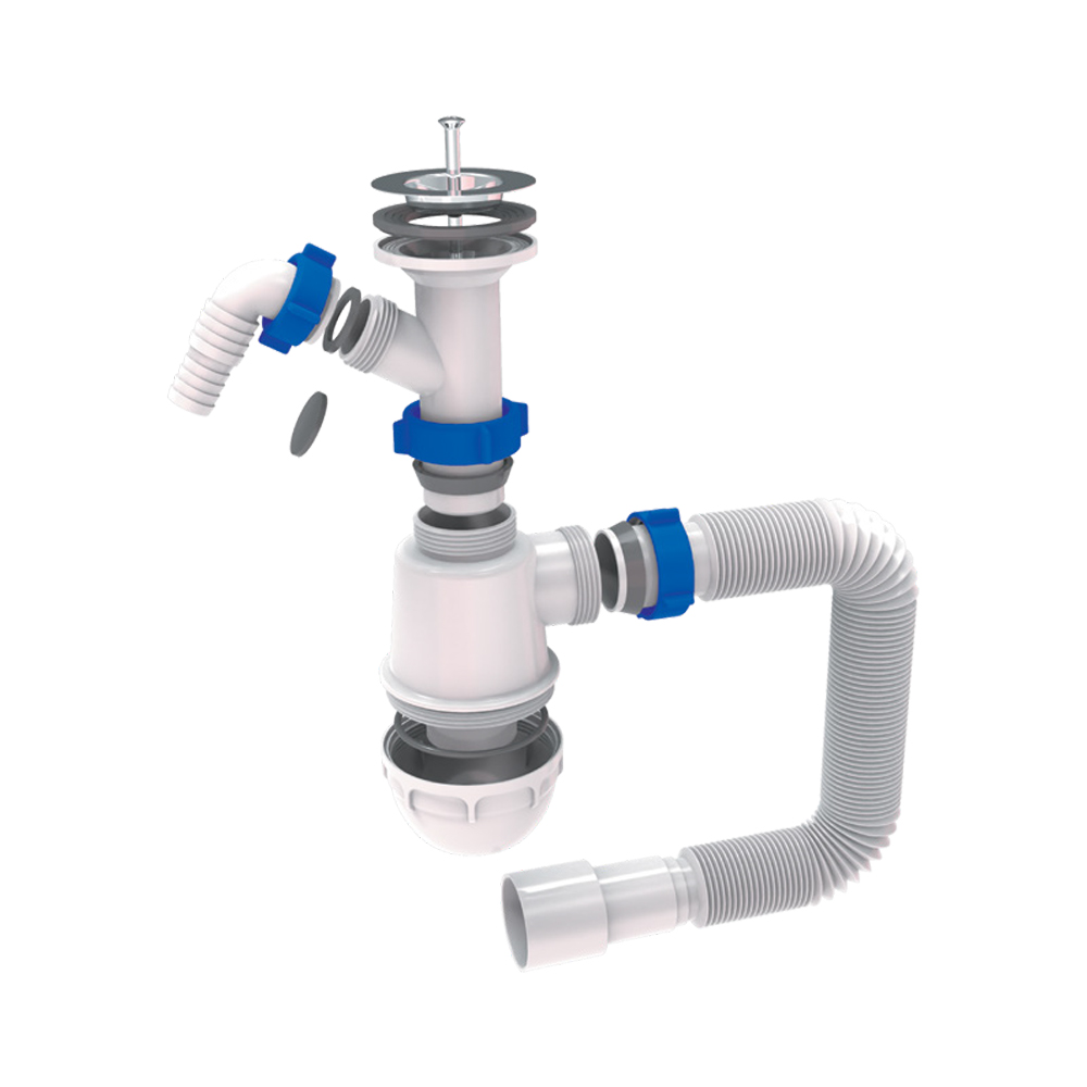- Встановлення: встановіть випуск (Ø70 мм) у зливний отвір мийки, знизу прикрутіть корпус, забезпечивши щільне прилягання ущільнювачів.