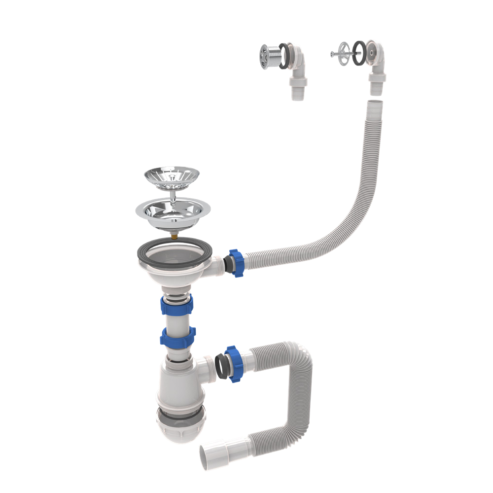 - Встановлення: встановіть випуск (Ø115 мм) та перелив у відповідні отвори мийки, знизу прикрутіть корпус, забезпечивши щільне прилягання ущільнювачів.