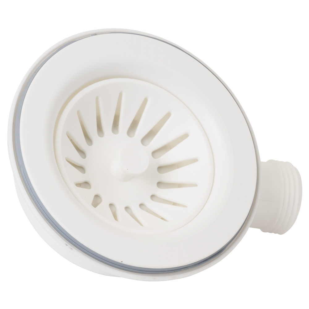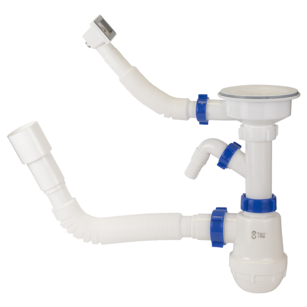 Сифон для кухонної мийки Tau з пластиковим випуском 3½" виводом під пральну машину квадратним переливом та гнучким відводом Ø40/50 мм (Білий) - це практичний та багатофункціональний продукт, розроблений для ефективного відведення води із сучасних кухонних мийок та підключення побутової техніки. Дана модель оснащена великим випуском Ø115 мм (3½") з термостійкого пластику та квадратним переливом для захисту від переповнення. Наявність спеціального виходу для підключення пральної або посудомийної машини розширює функціональність, а гнучкий гофрований відвід з універсальним адаптером Ø40/50 мм забезпечує просте та герметичне з'єднання з каналізаційною системою.