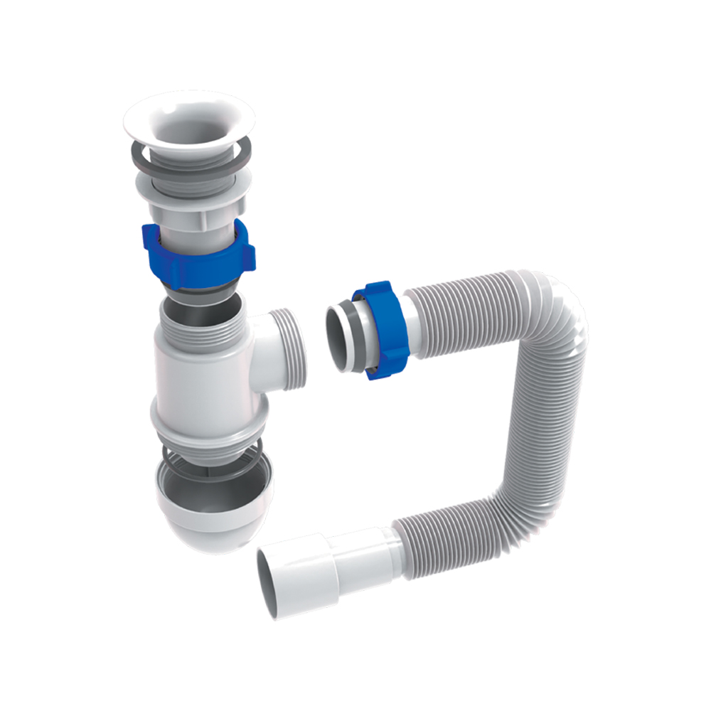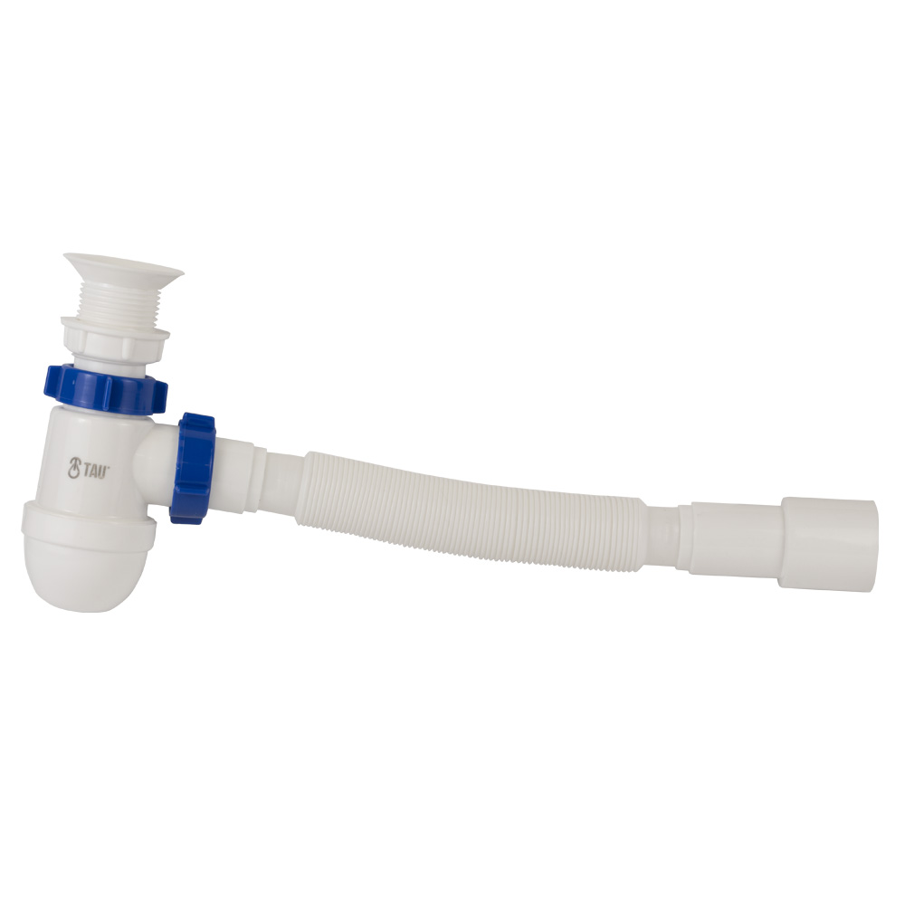 Сифон для раковини Tau з пластмасовим випуском і гнучким відведенням 1½"ר40/50мм - це якісний продукт, розроблений для ефективного відведення води з раковини. Ця модель має випуск Ø70 з термостійкого пластику та гнучке відведення Ø40/50 мм, що забезпечує надійне та герметичне з'єднання з каналізаційною системою.