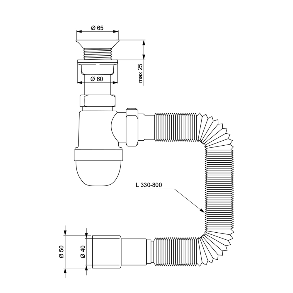 Сифон для раковини Tau з пластмасовим випуском і гнучким відведенням 1½"ר40/50 мм