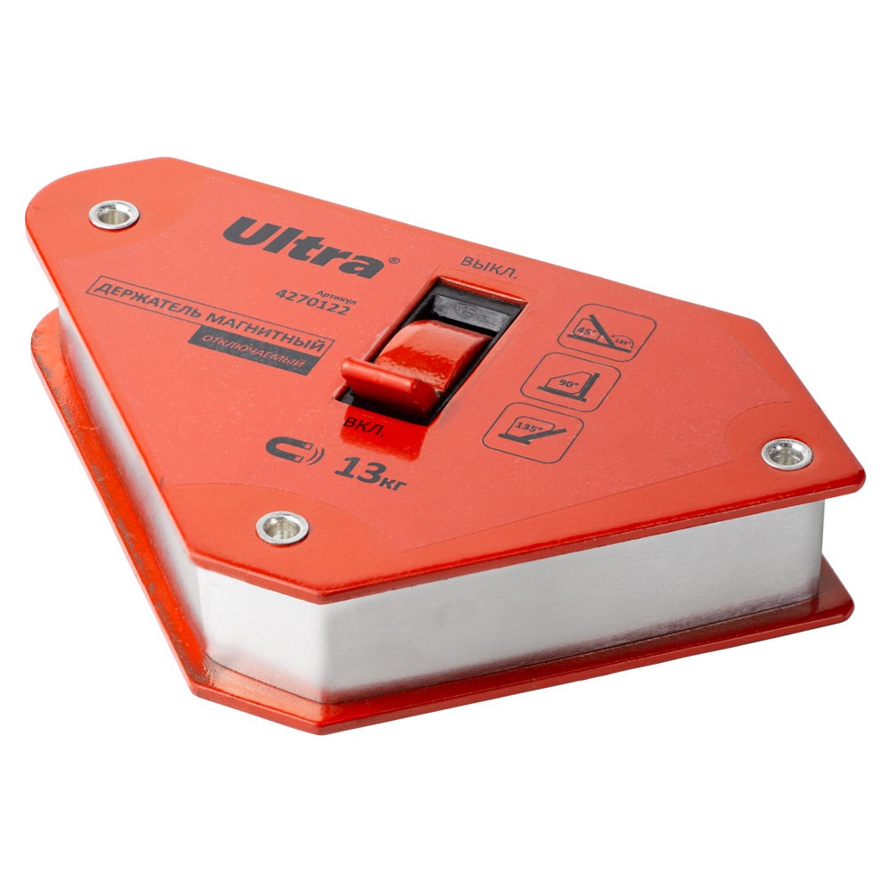 Тримач магнітний Ultra вимикний 13 кг 95 х 80 х 98 мм (45,90,135°) — професійне допоміжне обладнання, розроблене для швидкої та точної фіксації сталевих деталей під час виконання зварювальних, монтажних та складальних робіт. Завдяки можливості виставлення кутів у 45, 90 та 135 градусів, дана модель значно спрощує процес позиціонування заготовок, дозволяючи майстру працювати без сторонньої допомоги.