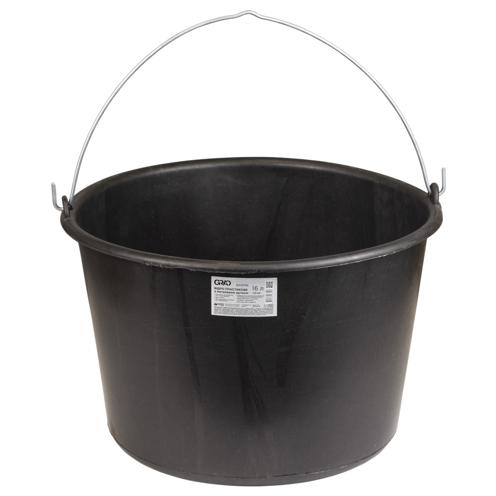 Відро Grad пластикове з металевою ручкою 16 л - відрізняється збільшеним об'ємом та високою міцністю, що робить його ідеальним вибором для масштабних будівельних та сільськогосподарських робіт. Виготовлене з чорного поліпропілену, який зберігає еластичність і не тріскається під навантаженням, що дозволяє використовувати ємність для замішування розчинів та перенесення важкого будівельного сміття. Виріб оснащений надійною металевою ручкою та призначений виключно для нехарчових продуктів.