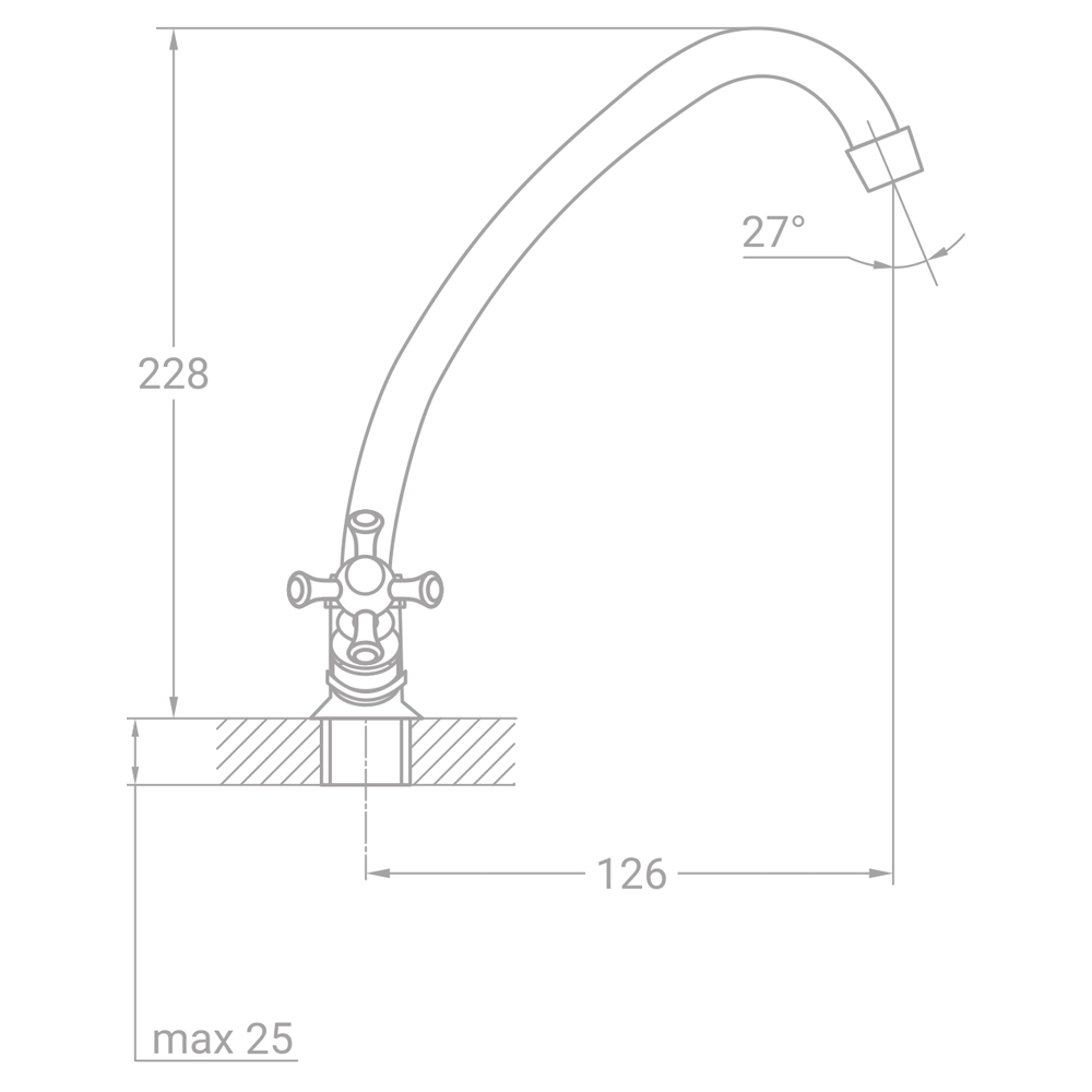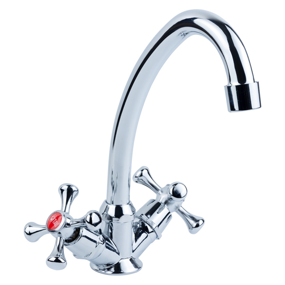 Змішувач для кухні TAU s85 1/2" економ на шпильці — це економічний кран у класичному стилі, який стане практичним рішенням для дачі або літньої кухні. Його високий J-подібний вилив обертається на 360°, а традиційне двовентильне керування з кольоровими заглушками забезпечує простоту та надійність у використанні.