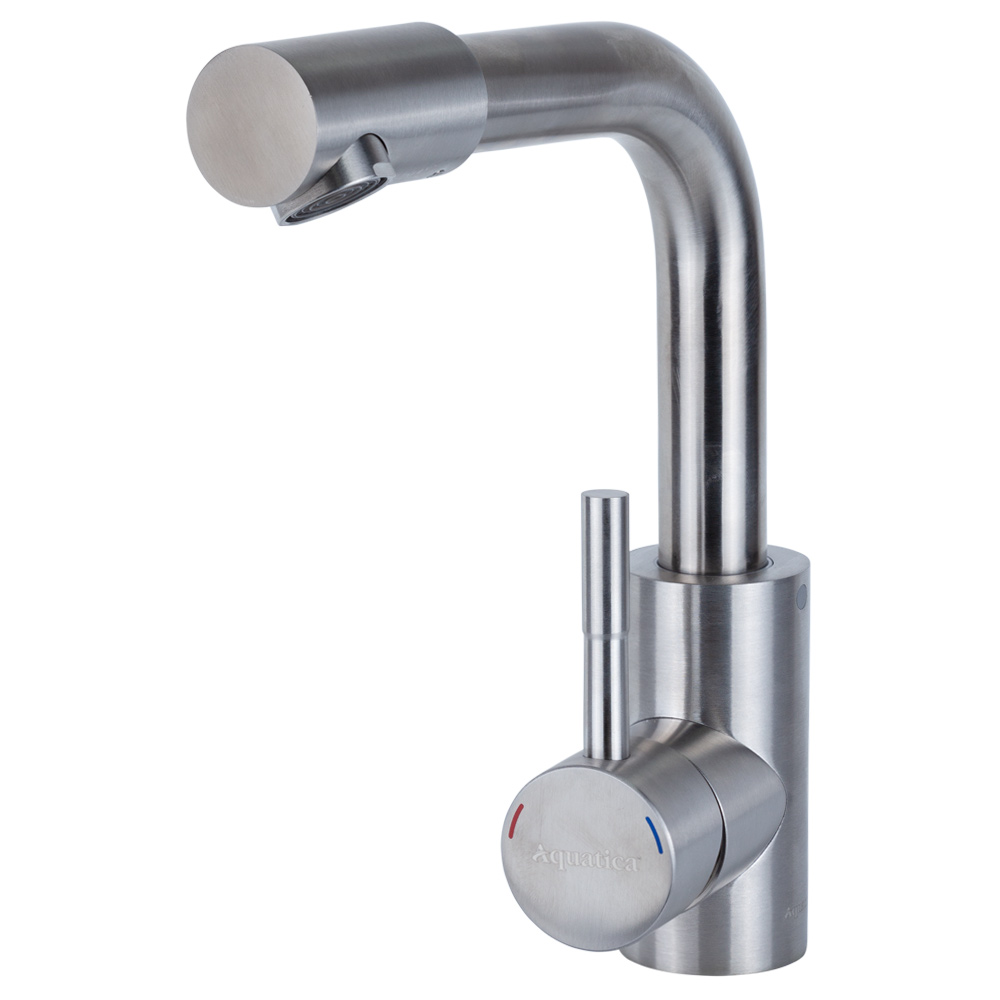 Змішувач для раковини Aquatica SS KT на гайці Ø35 мм - стильний кран з харчової нержавіючої сталі, створений для сучасних інтер'єрів у стилі лофт або хай-тек. Його суворий Г-подібний вилив та матова сатинована поверхня стануть центром тяжіння на вашій раковині.